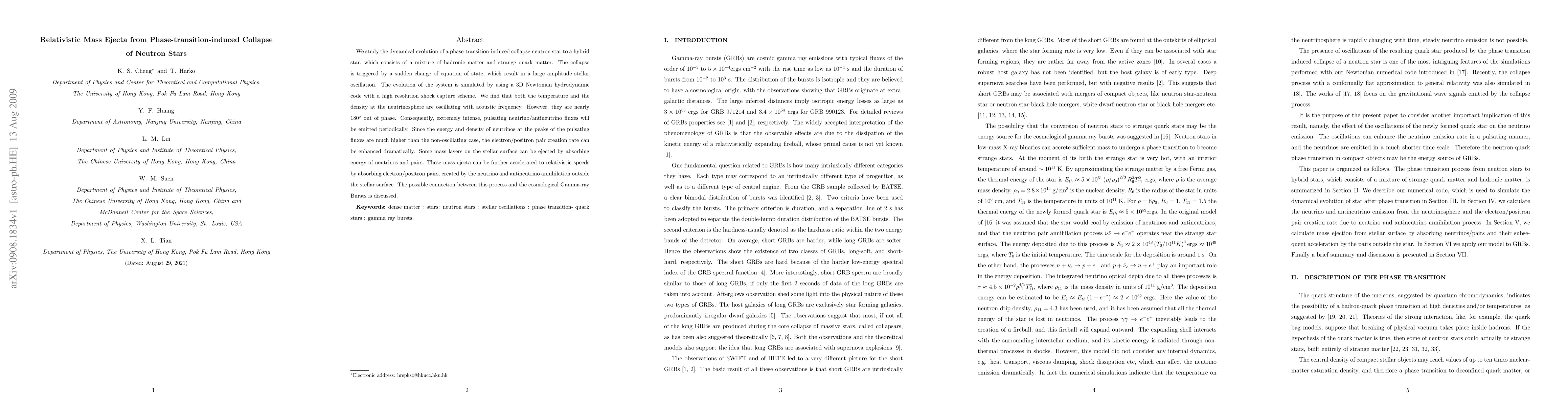 We study the dynamical evolution of a phase-transition-induced collapse neutron star to a hybrid star, which consists of a mixture of hadronic matter and strange quark matter. The collapse is triggered by a sudden change of equation of state, which result in a large amplitude stellar oscillation. The evolution of the system is simulated by using a 3D Newtonian hydrodynamic code with a high resolution shock capture scheme. We find that both the temperature and the density at the neutrinosphere are oscillating with acoustic frequency. However, they are nearly 180$^{\circ}$ out of phase. Consequently, extremely intense, pulsating neutrino/antineutrino fluxes will be emitted periodically. Since the energy and density of neutrinos at the peaks of the pulsating fluxes are much higher than the non-oscillating case, the electron/positron pair creation rate can be enhanced dramatically. Some mass layers on the stellar surface can be ejected by absorbing energy of neutrinos and pairs. These mass ejecta can be further accelerated to relativistic speeds by absorbing electron/positron pairs, created by the neutrino and antineutrino annihilation outside the stellar surface. The possible connection between this process and the cosmological Gamma-ray Bursts is discussed.