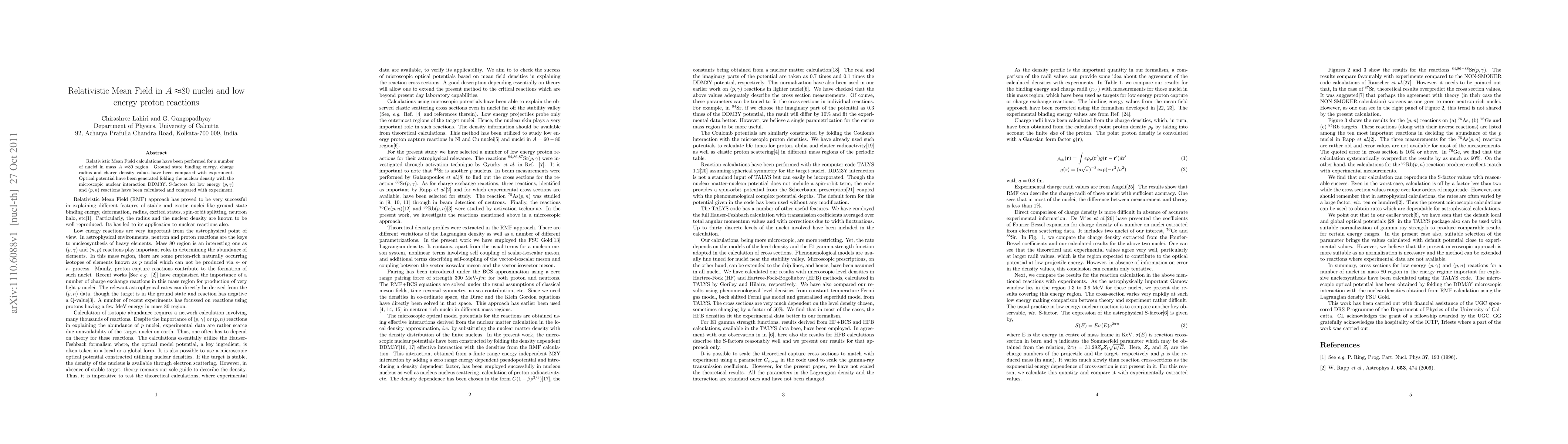 Relativistic Mean Field calculations have been performed for a number of nuclei in mass $A\approx$80 region. Ground state binding energy, charge radius and charge density values have been compared with experiment. Optical potential have been generated folding the nuclear density with the microscopic nuclear interaction DDM3Y. S-factors for low energy ($p,\gamma$) and ($p,n$) reactions have been calculated and compared with experiment.
