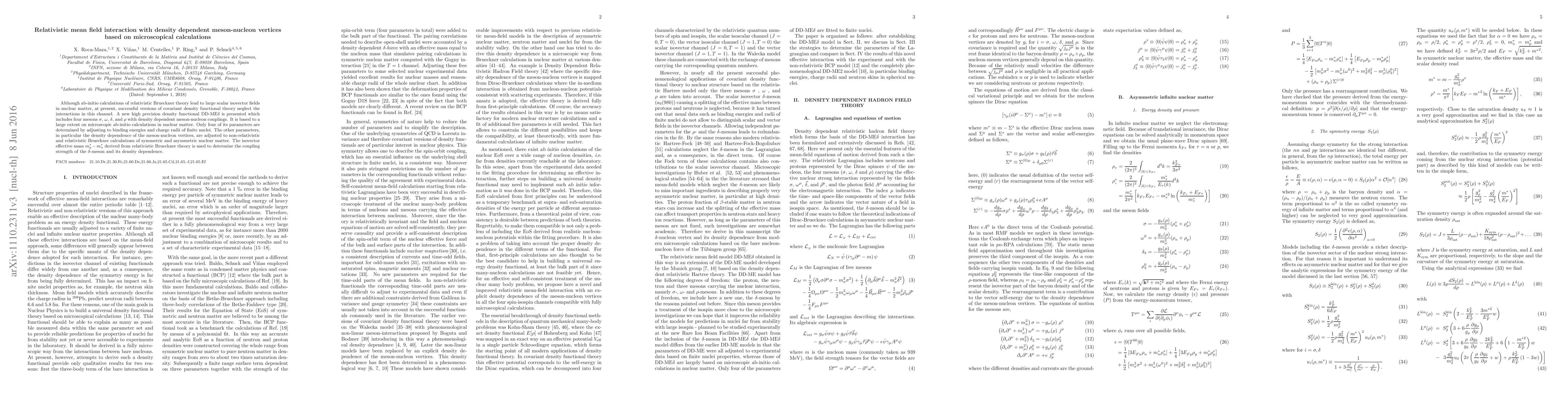 This paper introduces a new relativistic mean field density functional theory, DD-ME$\delta$, incorporating four mesons with density-dependent couplings, based on microscopic ab-initio calculations and adjusted to match nuclear matter properties from both non-relativistic and relativistic Brueckner theories. The model is calibrated to finite nuclei's binding energies and charge radii, with additional parameters determined from nuclear matter calculations.