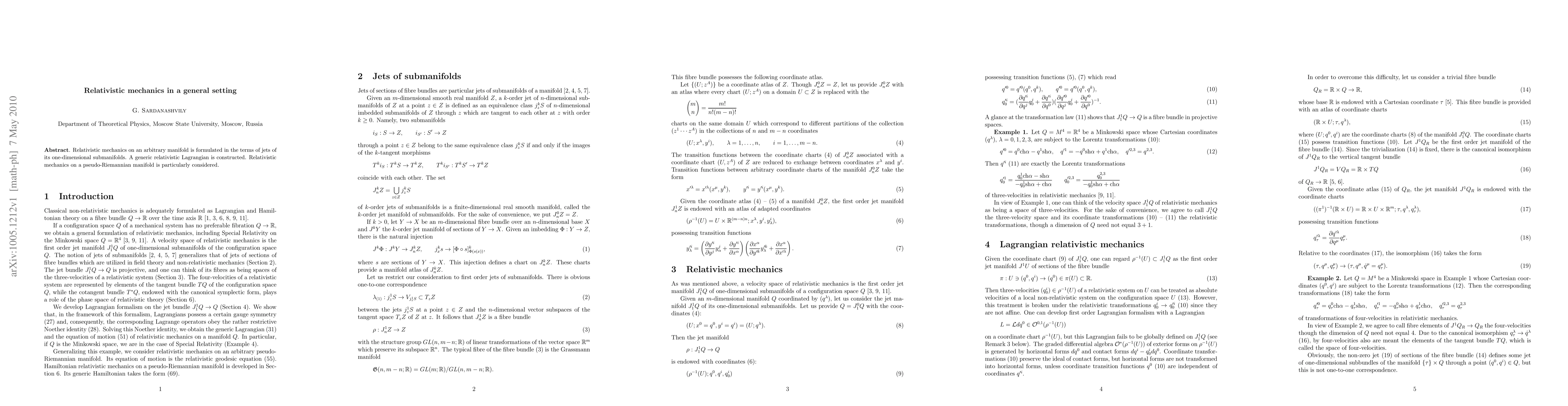 The paper introduces a novel approach to relativistic mechanics on general manifolds using jet bundles and constructs a generic relativistic Lagrangian with gauge symmetry, providing a solid mathematical foundation for describing relativistic dynamics in diverse settings.
