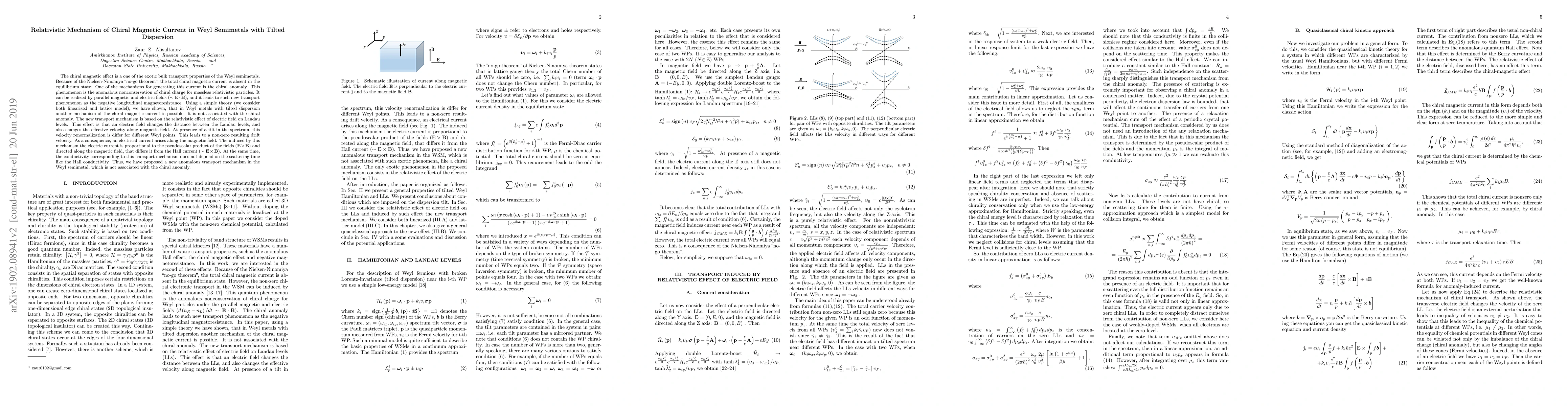 This paper explores a novel relativistic mechanism for generating chiral magnetic current in Weyl semimetals with tilted dispersion, independent of the chiral anomaly. It proposes that an electric field modifies Landau levels and effective velocities, leading to a non-zero drift velocity and an electric current along the magnetic field, distinct from the Hall current.