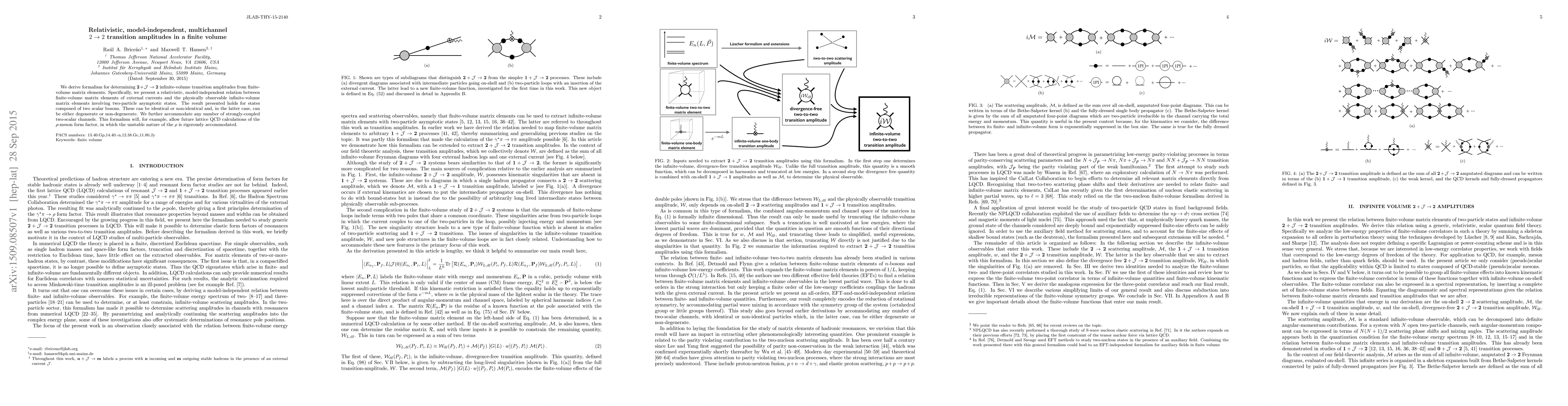 We derive formalism for determining $\textbf{2} + \mathcal J \to \textbf{2}$ infinite-volume transition amplitudes from finite-volume matrix elements. Specifically, we present a relativistic, model-independent relation between finite-volume matrix elements of external currents and the physically observable infinite-volume matrix elements involving two-particle asymptotic states. The result presented holds for states composed of two scalar bosons. These can be identical or non-identical and, in the latter case, can be either degenerate or non-degenerate. We further accommodate any number of strongly-coupled two-scalar channels. This formalism will, for example, allow future lattice QCD calculations of the $\rho$-meson form factor, in which the unstable nature of the $\rho$ is rigorously accommodated.
