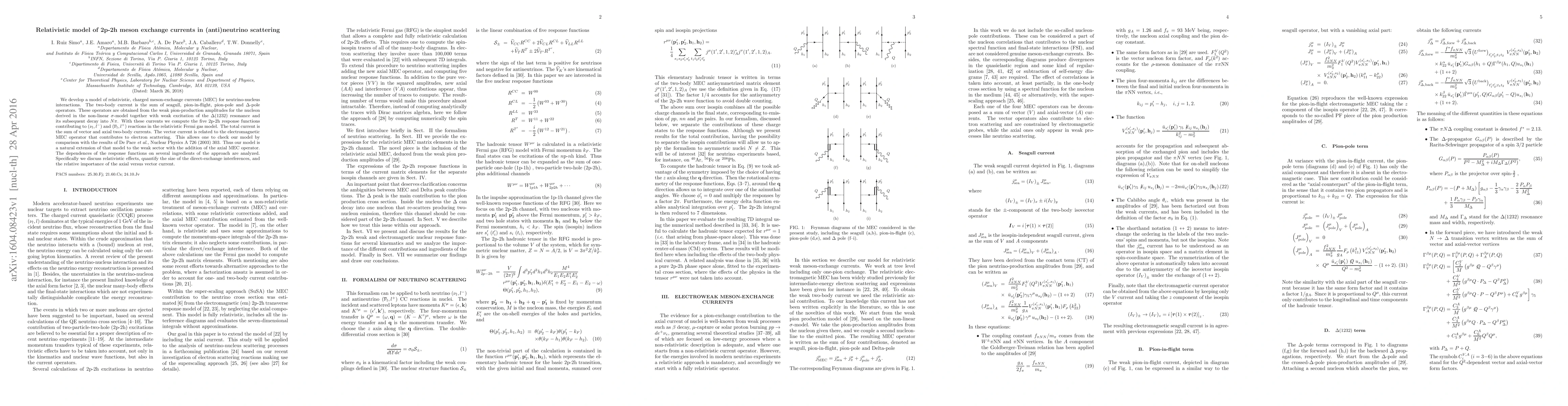 This paper develops a relativistic model for charged meson-exchange currents in neutrino-nucleus interactions, incorporating various operators for pion and Delta-resonance contributions. The study computes 2p-2h response functions for neutrino and antineutrino scattering, comparing the model's predictions with existing electromagnetic MEC results to validate its extension to the weak sector.