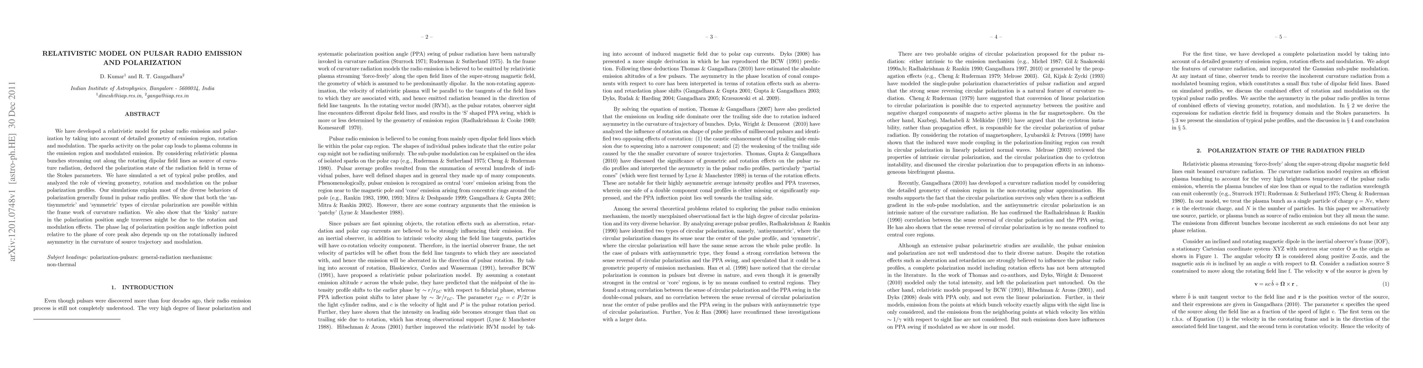 This paper presents a relativistic model explaining pulsar radio emission and polarization, considering the geometry of the emission region and rotation. The model attributes diverse polarization behaviors to curvature radiation from relativistic plasma bunches, explaining both antisymmetric and symmetric circular polarizations and the kinks in polarization position angle traverses due to rotation and modulation effects.