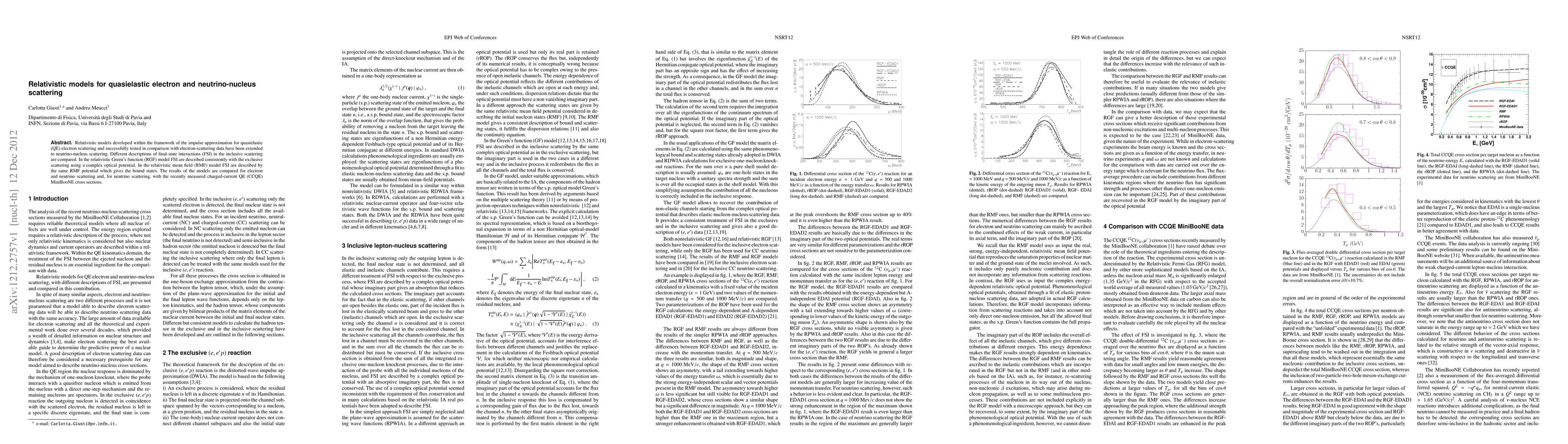 Relativistic models developed within the framework of the impulse approximation for quasielastic (QE) electron scattering and successfully tested in comparison with electron-scattering data have been extended to neutrino-nucleus scattering. Different descriptions of final-state interactions (FSI) in the inclusive scattering are compared. In the relativistic Green's function (RGF) model FSI are described consistently with the exclusive scattering using a complex optical potential. In the relativistic mean field (RMF) model FSI are described by the same RMF potential which gives the bound states. The results of the models are compared for electron and neutrino scattering and, for neutrino scattering, with the recently measured charged-current QE (CCQE) MiniBooNE cross sections.