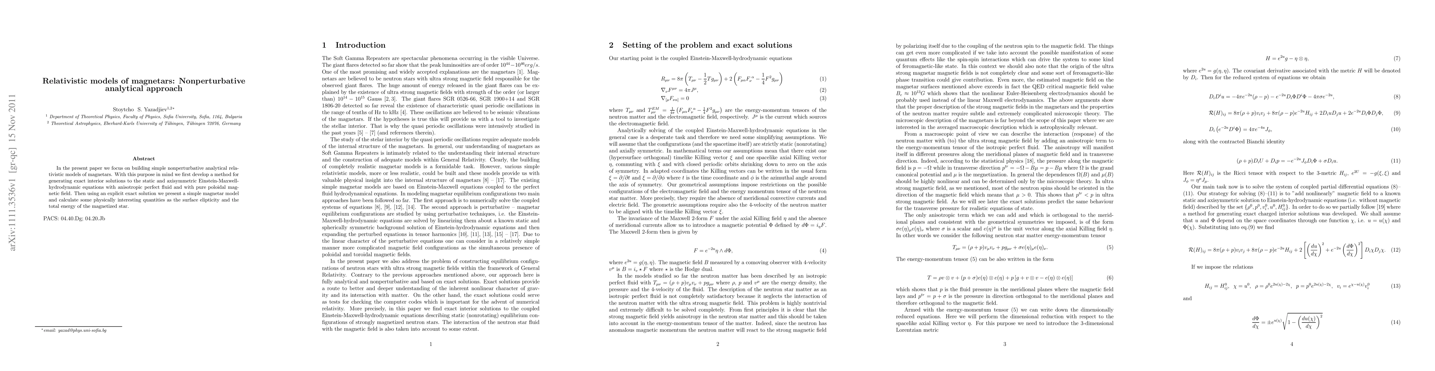 Researchers developed nonperturbative analytical models of magnetars using exact solutions to Einstein-Maxwell-hydrodynamic equations, focusing on surface ellipticity and total energy calculations.