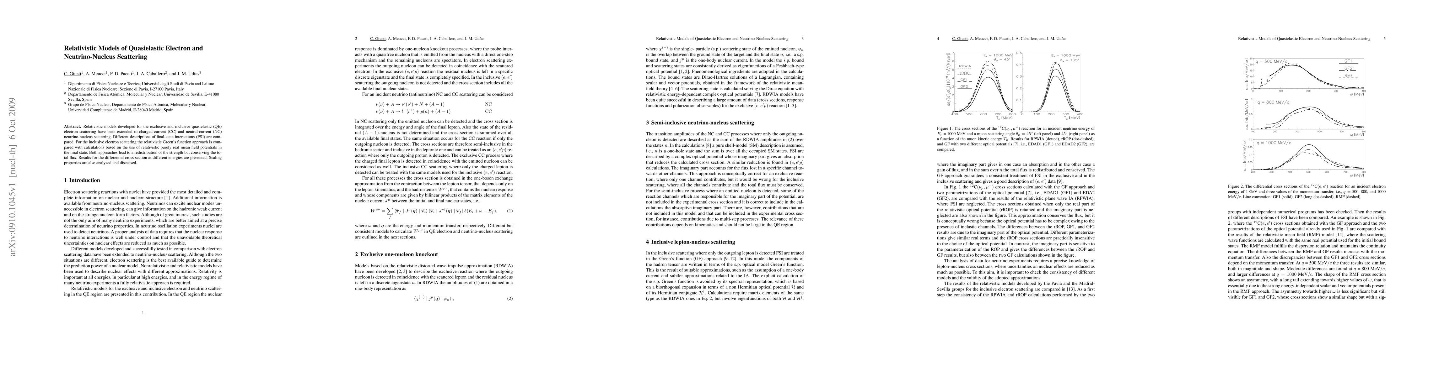 Relativistic models developed for the exclusive and inclusive quasielastic (QE) electron scattering have been extended to charged-current (CC) and neutral-current (NC) neutrino-nucleus scattering. Different descriptions of final-state interactions (FSI) are compared. For the inclusive electron scattering the relativistic Green's function approach is compared with calculations based on the use of relativistic purely real mean field potentials in the final state. Both approaches lead to a redistribution of the strength but conserving the total flux. Results for the differential cross section at different energies are presented. Scaling properties are also analyzed and discussed.