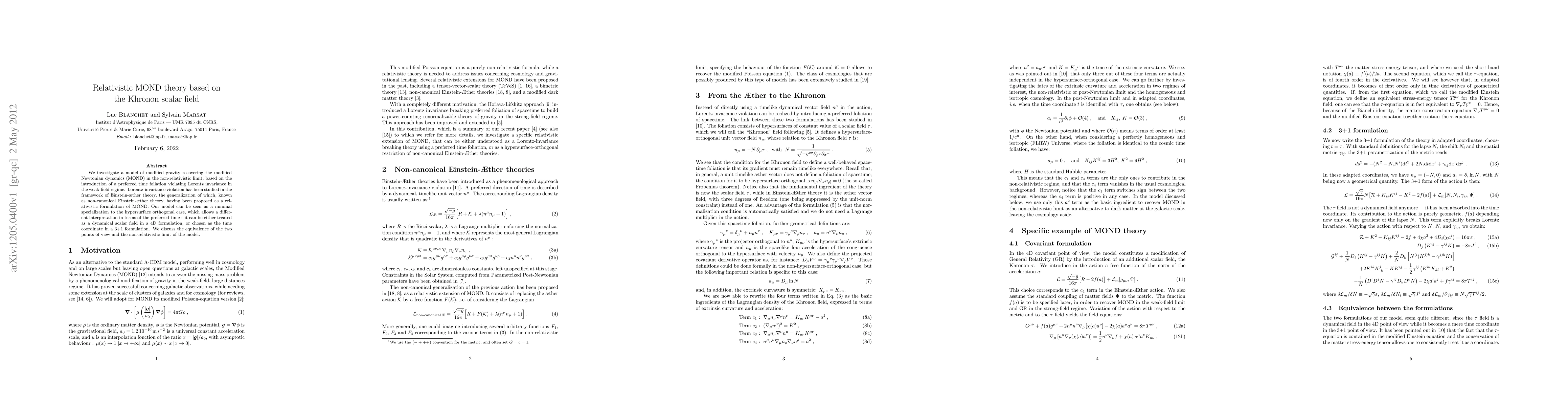 This paper proposes a relativistic Modified Newtonian Dynamics (MOND) theory using a Khronon scalar field, interpretable as a dynamical 4D scalar or a time coordinate in 3+1 formulation. It explores the equivalence of these views and the non-relativistic limit of the model.