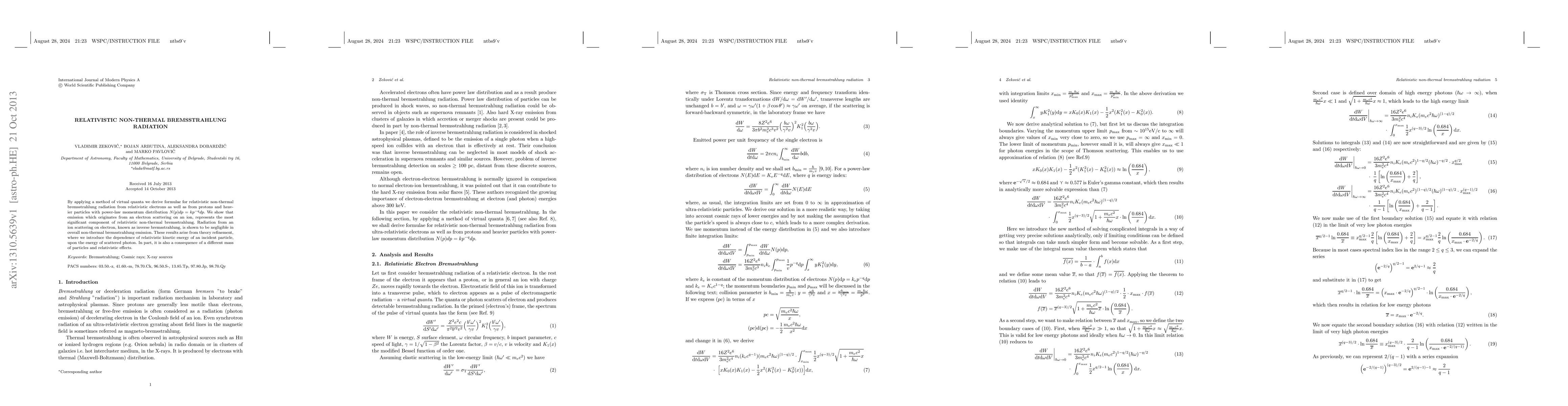 Researchers develop formulas for relativistic non-thermal bremsstrahlung radiation from electrons and heavier particles, finding that electron scattering on ions is the primary source of emission.