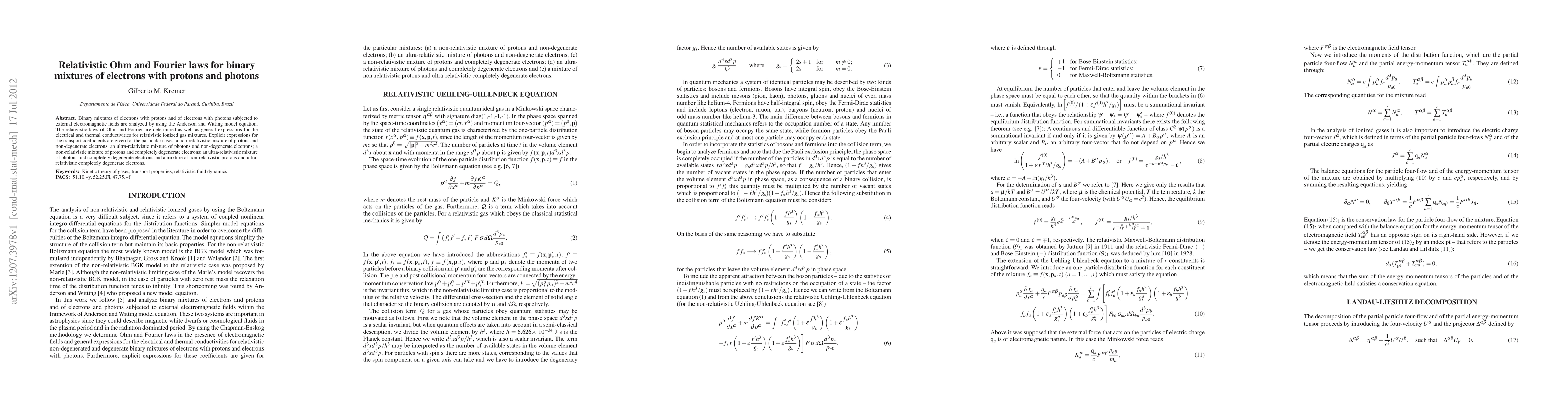 This paper investigates the relativistic Ohm and Fourier laws for binary mixtures of electrons with protons and photons under electromagnetic fields, deriving general expressions for electrical and thermal conductivities. It provides explicit transport coefficient expressions for various specific mixtures, including non-relativistic protons with non-degenerate electrons and ultra-relativistic photons with non-degenerate electrons.