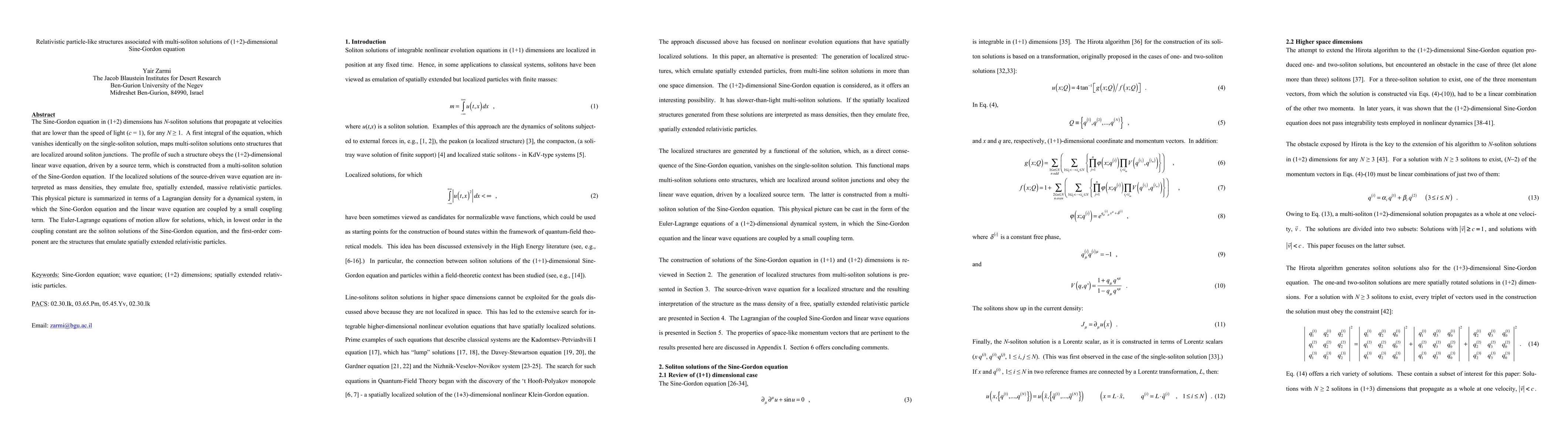 The Sine-Gordon equation in (1+2) dimensions has N-soliton solutions that propagate at velocities that are lower than the speed of light (c = 1), for any N greater tha or equal to 1. A first integral of the equation, which vanishes identically on the single soliton solution, maps multisoliton solutions onto structures that are localized around soliton junctions. The profile of such a structure obeys the (1+2)-dimensional linear wave equation, driven by a source term, which is constructed from a multisoliton solution of the Sine-Gordon equation. If the localized solutions of the source-driven wave equation are interpreted as mass densities, they emulate free, spatially extended, massive relativistic particles. This physical picture is summarized in terms of a Lagrangian density for a dynamical system, in which the Sine-Gordon equation and the linear wave equation are coupled by a small coupling term. The Euler-Lagrange equations of motion allow for solutions, which, in lowest order in the coupling constant are the soliton solutions of the Sine-Gordon equation, and the first-order component are the structures that emulate spatially extended relativistic particles.