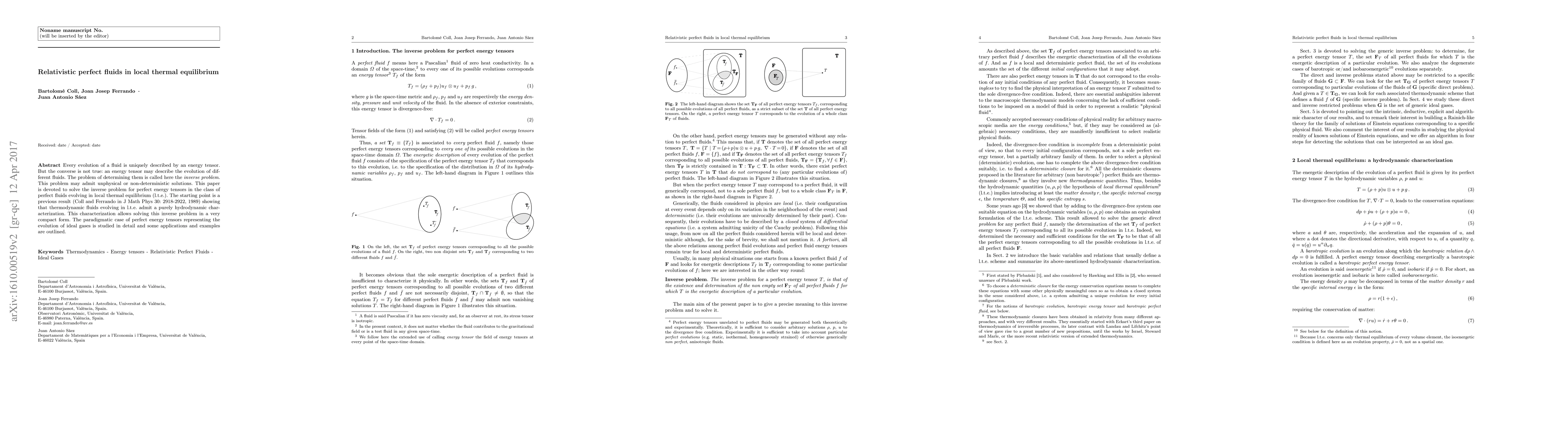 Every evolution of a fluid is uniquely described by an energy tensor. But the converse is not true: an energy tensor may describe the evolution of different fluids. The problem of determining them is called here the {\em inverse problem}. This problem may admit unphysical or non-deterministic solutions. This paper is devoted to solve the inverse problem for perfect energy tensors in the class of perfect fluids evolving in local thermal equilibrium (l.t.e.). The starting point is a previous result (Coll and Ferrando in J Math Phys 30: 2918-2922, 1989) showing that thermodynamic fluids evolving in l.t.e. admit a purely hydrodynamic characterization. This characterization allows solving this inverse problem in a very compact form. The paradigmatic case of perfect energy tensors representing the evolution of ideal gases is studied in detail and some applications and examples are outlined.