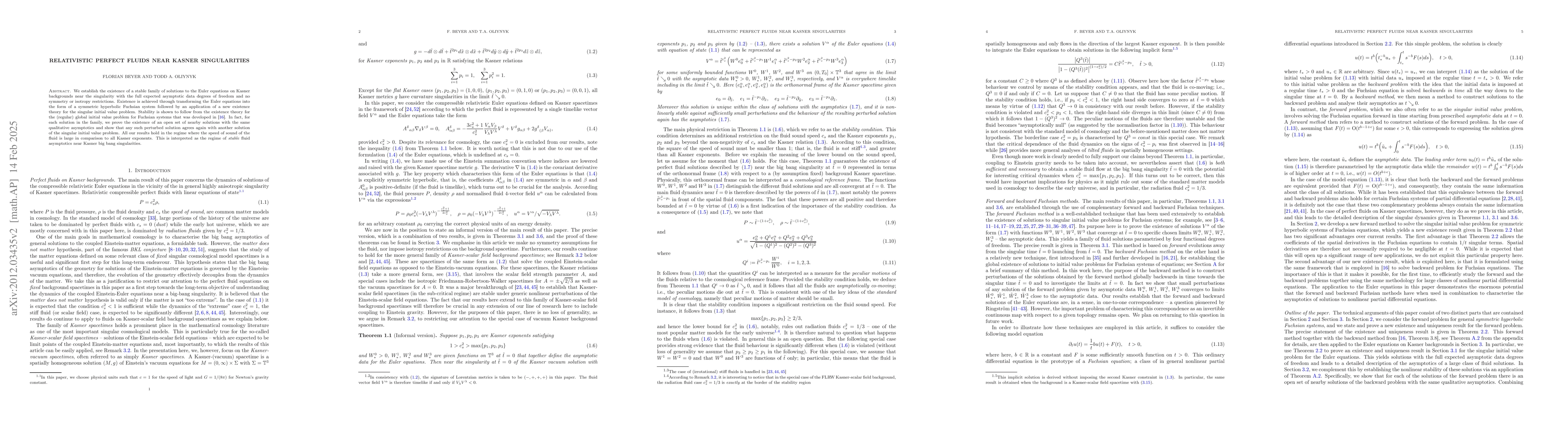 Researchers prove the existence of stable fluid solutions near Kasner singularities, showing that perfect fluids can exist in a region with no symmetry or isotropy restrictions, even in the presence of a big bang singularity.