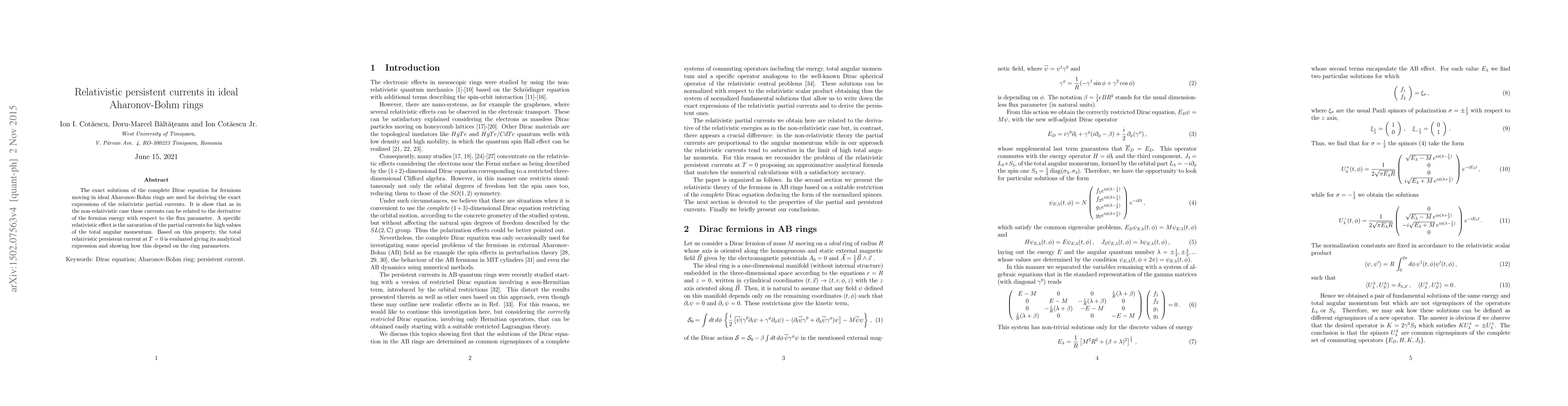 This paper derives exact expressions for relativistic partial currents in ideal Aharonov-Bohm rings using Dirac equation solutions, revealing a saturation effect for high angular momentum and providing an analytical expression for the total relativistic persistent current at zero temperature.