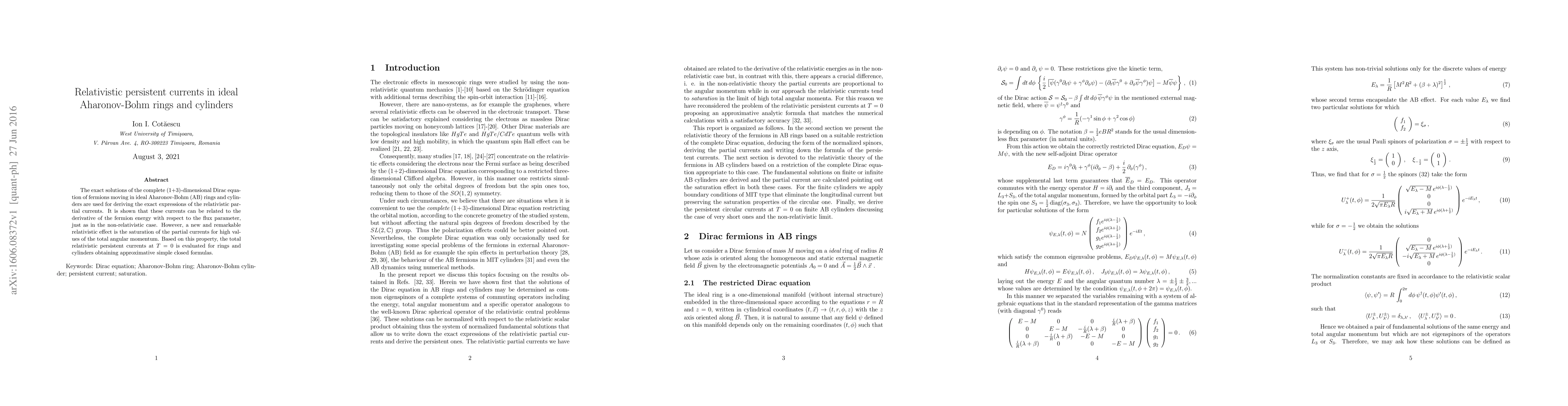 This paper derives exact relativistic partial currents for fermions in ideal Aharonov-Bohm rings and cylinders using the (1+3)-dimensional Dirac equation. It reveals a saturation effect for high angular momentum and provides simple formulas for total persistent currents at zero temperature.
