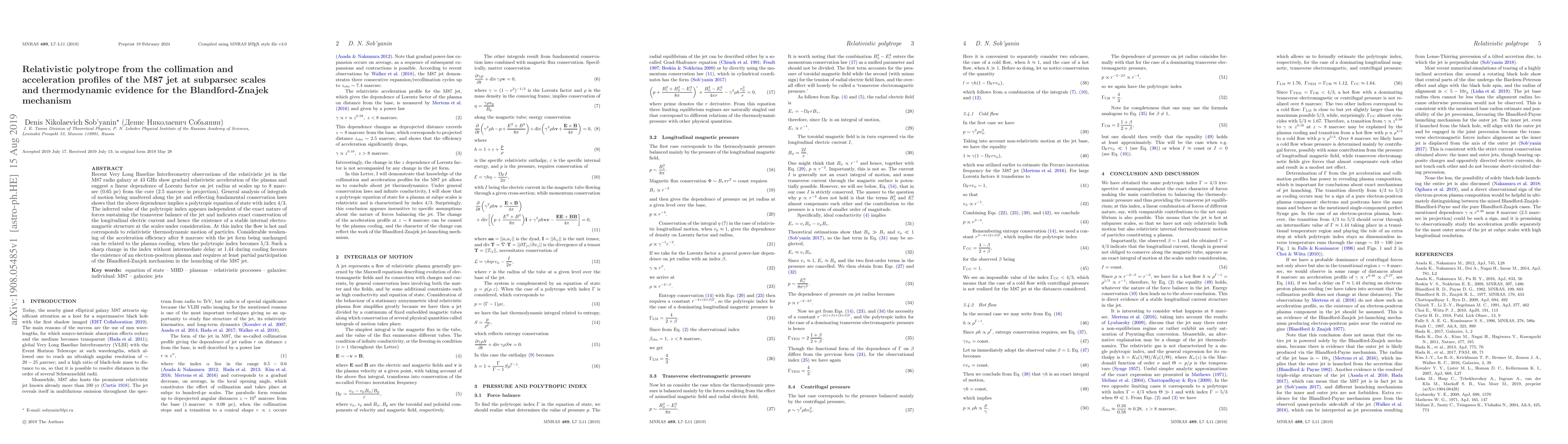 Recent Very Long Baseline Interferometry observations of the relativistic jet in the M87 radio galaxy at 43 GHz show gradual relativistic acceleration of the plasma and suggest a linear dependence of Lorentz factor on jet radius at scales up to 8 marcsec (0.65 pc) from the core (2.5 marcsec in projection). General analysis of integrals of motion being unaltered along the jet and reflecting fundamental conservation laws shows that the above dependence implies a polytropic equation of state with index 4/3. The inferred value of the polytropic index appears independent of the exact nature of forces sustaining the transverse balance of the jet and indicates exact conservation of the longitudinal electric current and hence the existence of a stable internal electromagnetic structure at the scales under consideration. At this index the flow is hot and corresponds to relativistic thermodynamic motion of particles. Considerable weakening of the acceleration efficiency after 8 marcsec with the jet form being unchanged can be related to the plasma cooling, when the polytropic index becomes 5/3. Such a sharp change in the index without intermediate delay at 1.44 during cooling favours the existence of an electron-positron plasma and requires at least partial participation of the Blandford-Znajek mechanism in the launching of the M87 jet.