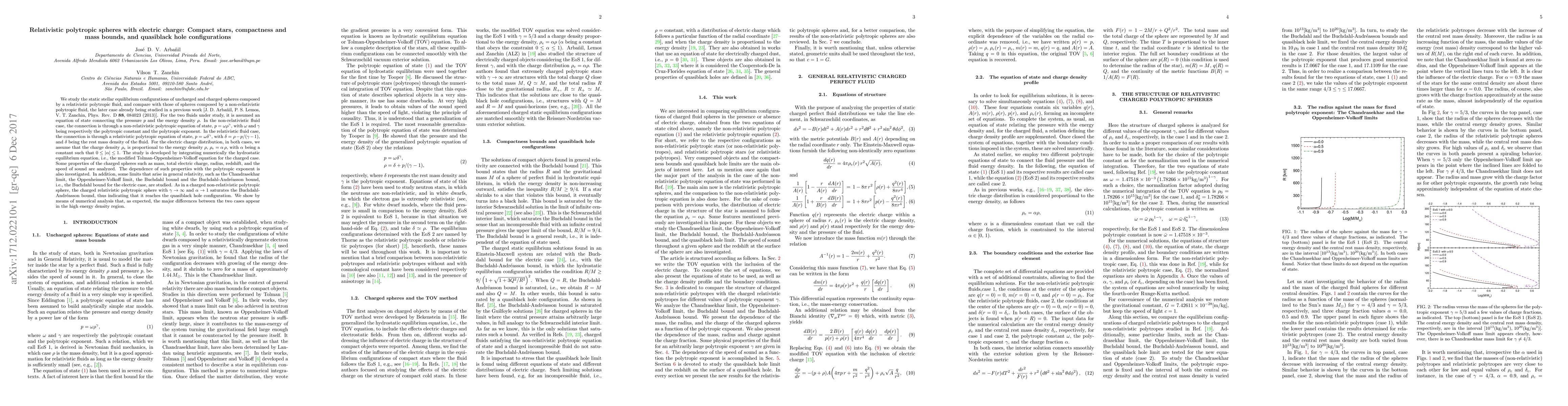 This paper investigates the static equilibrium configurations of relativistic and non-relativistic polytropic spheres, focusing on charged relativistic spheres composed of a relativistic polytropic fluid. The study compares the mass, charge, and other properties of these spheres, revealing significant differences in high energy density regions, and explores limits such as the Buchdahl bound, indicating the transition to quasiblack hole configurations.