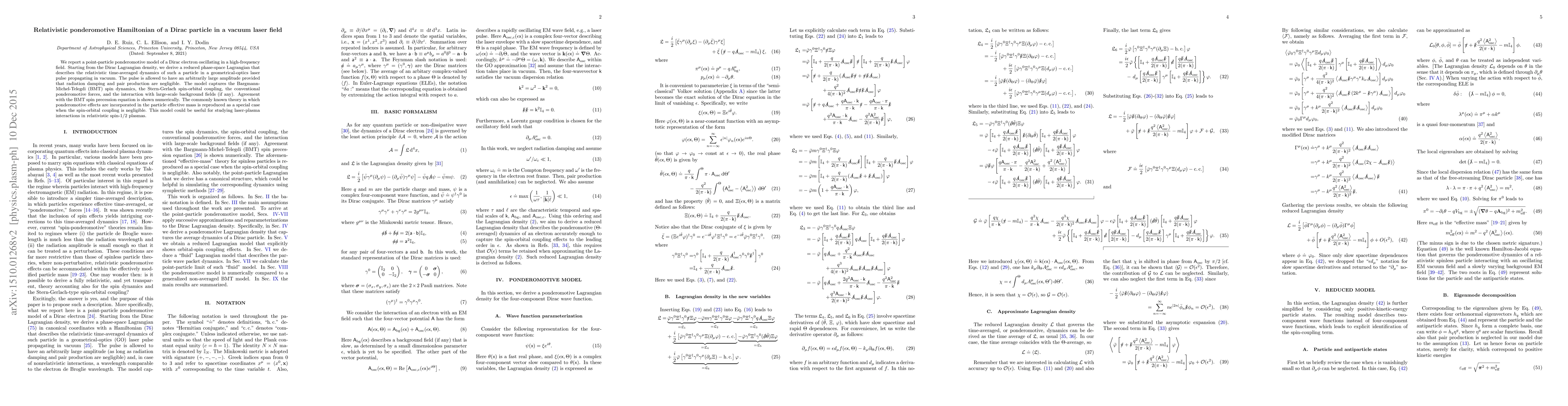 This paper derives a relativistic ponderomotive Hamiltonian for a Dirac electron in a high-frequency vacuum laser field, capturing spin dynamics and interactions, and reproduces known theories as special cases. The model is significant for studying relativistic spin-$1/2$ plasmas in laser-plasma interactions.