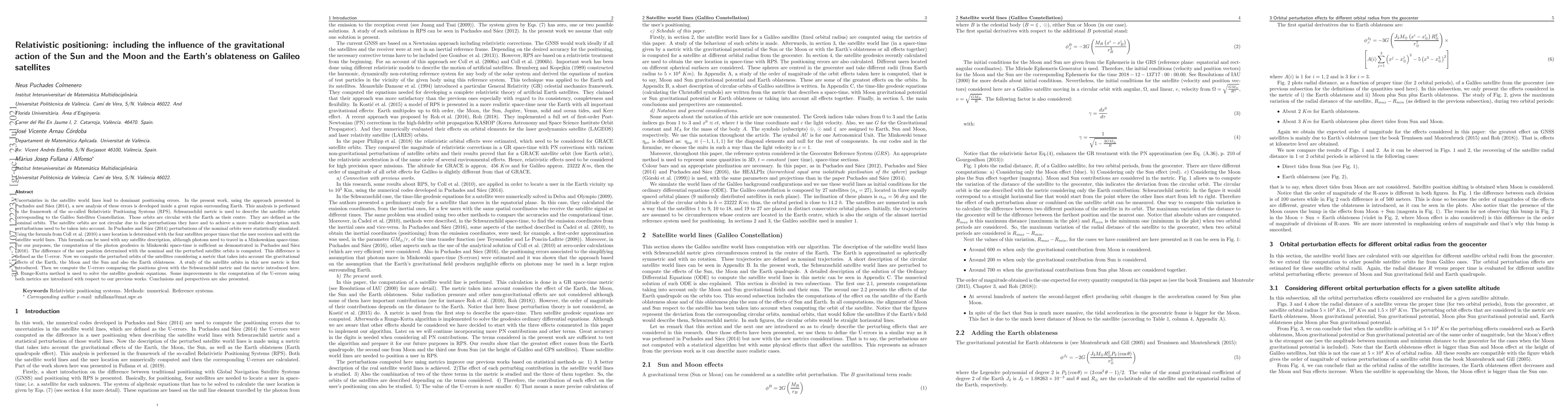 Uncertainties in the satellite world lines lead to dominant positioning errors. In the present work, using the approach presented in \cite{neu14}, a new analysis of these errors is developed inside a great region surrounding Earth. This analysis is performed in the framework of the so-called Relativistic Positioning Systems (RPS). Schwarzschild metric is used to describe the satellite orbits corresponding to the Galileo Satellites Constellation. Those orbits are circular with the Earth as their centre. They are defined as the nominal orbits. The satellite orbits are not circular due to the perturbations they have and to achieve a more realistic description such perturbations need to be taken into account. In \cite{neu14} perturbations of the nominal orbits were statistically simulated. Using the formula from \cite{col10a} a user location is determined with the four satellites proper times that the user receives and with the satellite world lines. This formula can be used with any satellite description, although photons need to travel in a Minkowskian space-time. For our purposes, the computation of the photon geodesics in Minkowski space-time is sufficient as demonstrated in \cite{neu16}. The difference of the user position determined with the nominal and the perturbed satellite orbits is computed. This difference is defined as the U-error. Now we compute the perturbed orbits of the satellites considering a metric that takes into account the gravitational effects of the Earth, the Moon and the Sun and also the Earth oblateness...