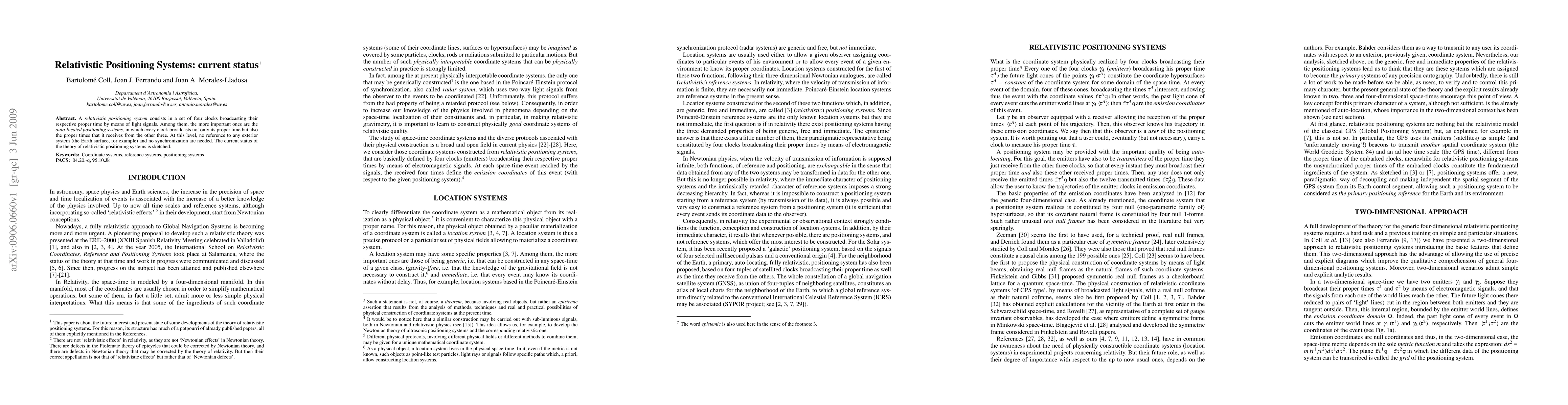 A {\em relativistic positioning system} consists in a set of four clocks broadcasting their respective proper time by means of light signals. Among them, the more important ones are the {\em auto-located positioning systems,} in which every clock broadcasts not only its proper time but also the proper times that it receives from the other three. At this level, no reference to any exterior system (the Earth surface, for example) and no synchronization are needed. The current status of the theory of relativistic positioning systems is sketched.