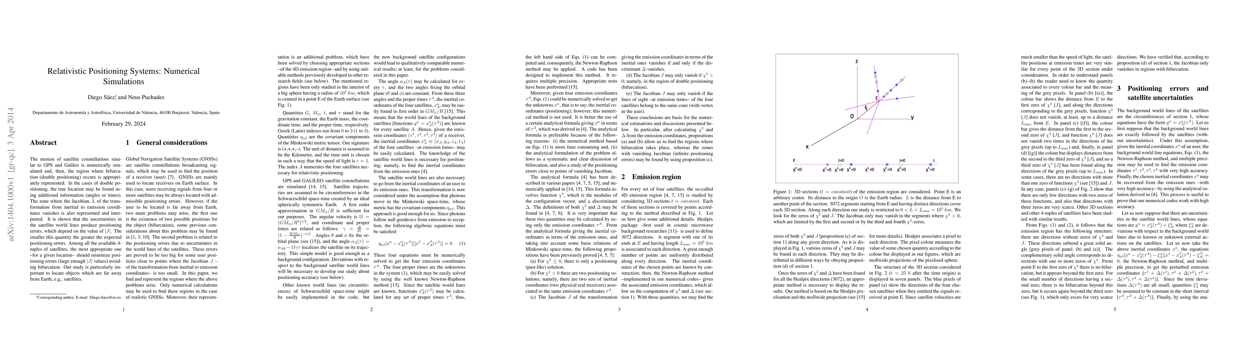 This paper numerically simulates satellite constellations like GPS and Galileo to identify regions where bifurcation (double positioning) occurs. It emphasizes the importance of additional information to resolve true locations and analyzes the Jacobian, J, to determine positioning errors, highlighting the need for large |J| values to minimize errors.