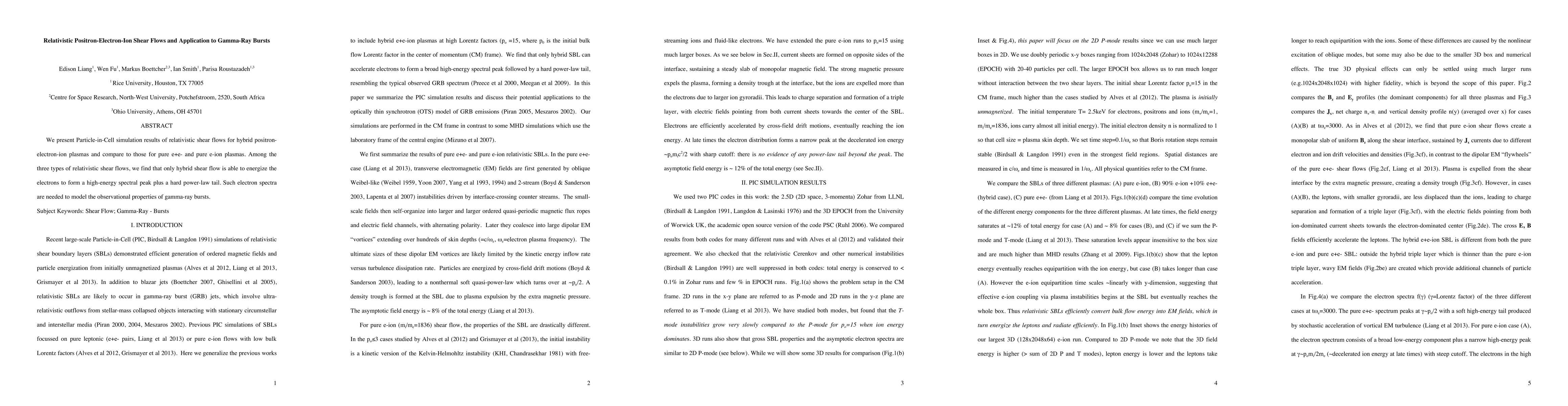 This paper uses Particle-in-Cell simulations to study relativistic shear flows in hybrid positron-electron-ion plasmas, finding that only these hybrid flows can produce electron spectra necessary to model gamma-ray bursts, unlike pure positron-electron or electron-ion plasmas.