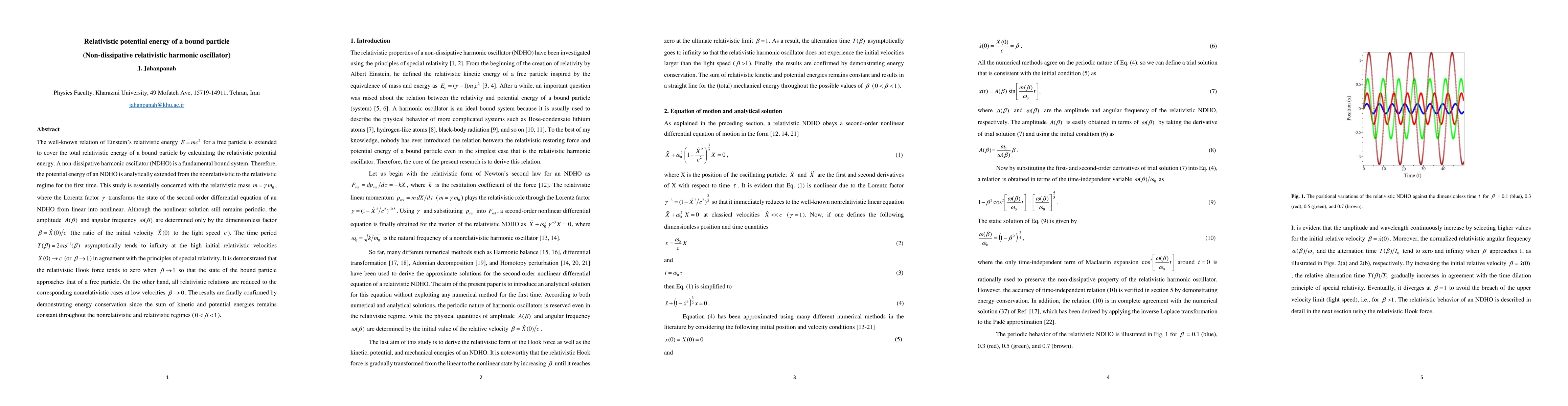 This paper extends Einstein's relativistic energy relation for free particles to bound particles, specifically analyzing the relativistic potential energy in a non-dissipative relativistic harmonic oscillator. It analytically transitions the potential energy of the oscillator from non-relativistic to relativistic regimes, confirming energy conservation throughout.