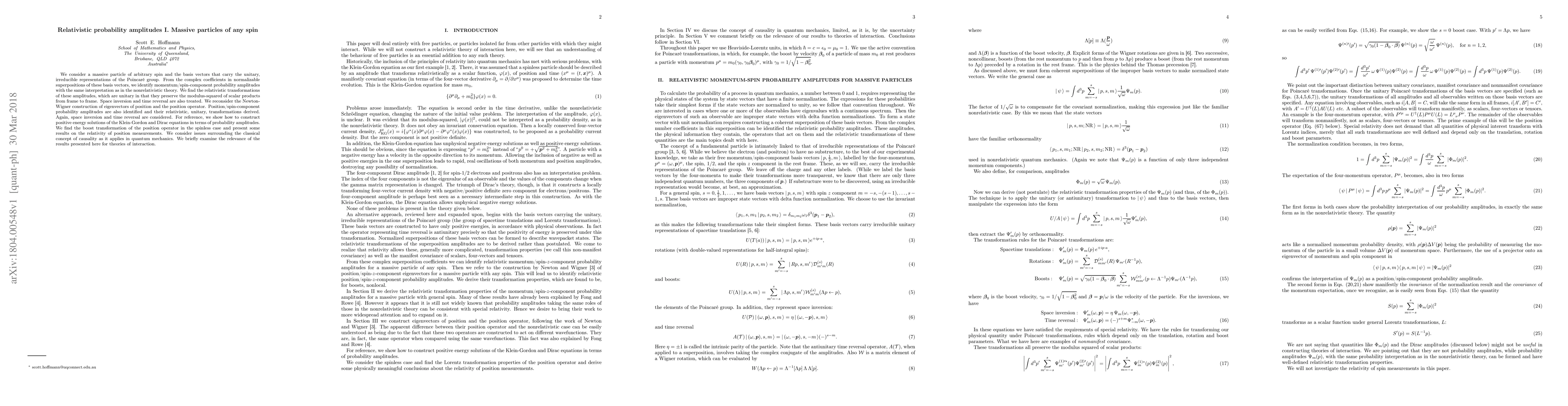 We consider a massive particle of arbitrary spin and the basis vectors that carry the unitary, irreducible representations of the Poincar\'e group. From the complex coefficients in normalizable superpositions of these basis vectors, we identify momentum/spin-component probability amplitudes with the same interpretation as in the nonrelativistic theory. We find the relativistic transformations of these amplitudes, which are unitary in that they preserve the modulus-squared of scalar products from frame to frame. Space inversion and time reversal are also treated. We reconsider the Newton- Wigner construction of eigenvectors of position and the position operator. Position/spin-component probability amplitudes are also identified and their relativistic, unitary, transformations derived. Again, space inversion and time reversal are considered. For reference, we show how to construct positive energy solutions of the Klein-Gordon and Dirac equations in terms of probability amplitudes. We find the boost transformation of the position operator in the spinless case and present some results on the relativity of position measurements. We consider issues surrounding the classical concept of causality as it applies in quantum mechanics. We briefly examine the relevance of the results presented here for theories of interaction.