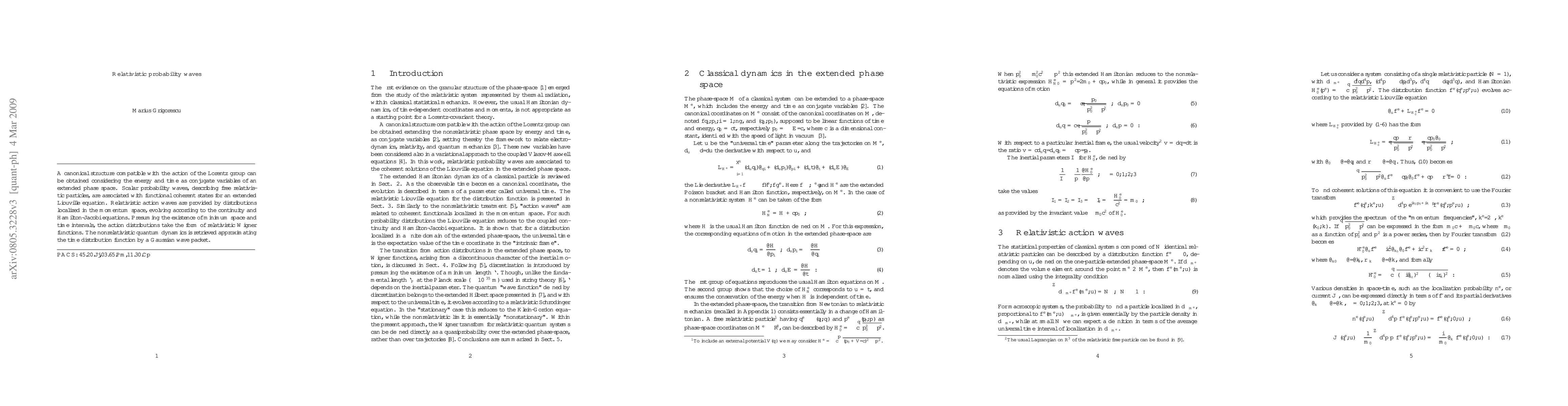 A canonical structure compatible with the action of the Lorentz group can be obtained considering the energy and time as conjugate variables of an extended phase space. Scalar probability waves, describing free relativistic particles, are associated with functional coherent states for an extended Liouville equation. Relativistic action waves are provided by distributions localized in the momentum space, evolving according to the continuity and Hamilton-Jacobi equations. Presuming the existence of minimum space and time intervals, the action distributions take the form of relativistic Wigner functions. The nonrelativistic quantum dynamics is retrieved approximating the time distribution function by a Gaussian wave packet.
