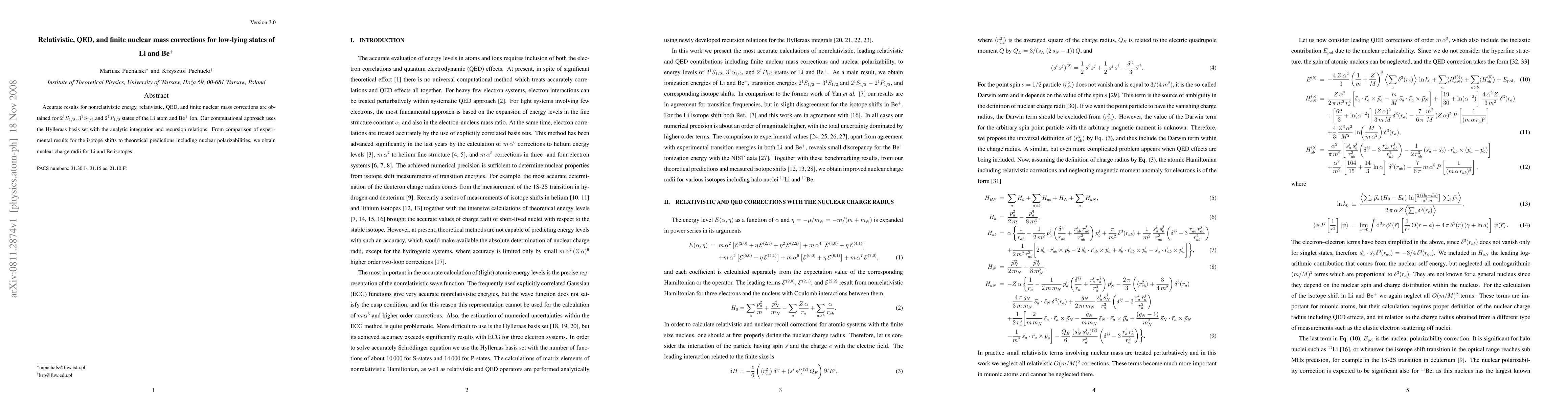 Accurate results for nonrelativistic energy, relativistic, QED, and finite nuclear mass corrections are obtained for $2^1S_{1/2}$, $3^1S_{1/2}$ and $2^1P_{1/2}$ states of the Li atom and Be$^+$ ion. Our computational approach uses the Hylleraas basis set with the analytic integration and recursion relations. From comparison of experimental results for the isotope shifts to theoretical predictions including nuclear polarizabilities, we obtain nuclear charge radii for Li and Be isotopes.