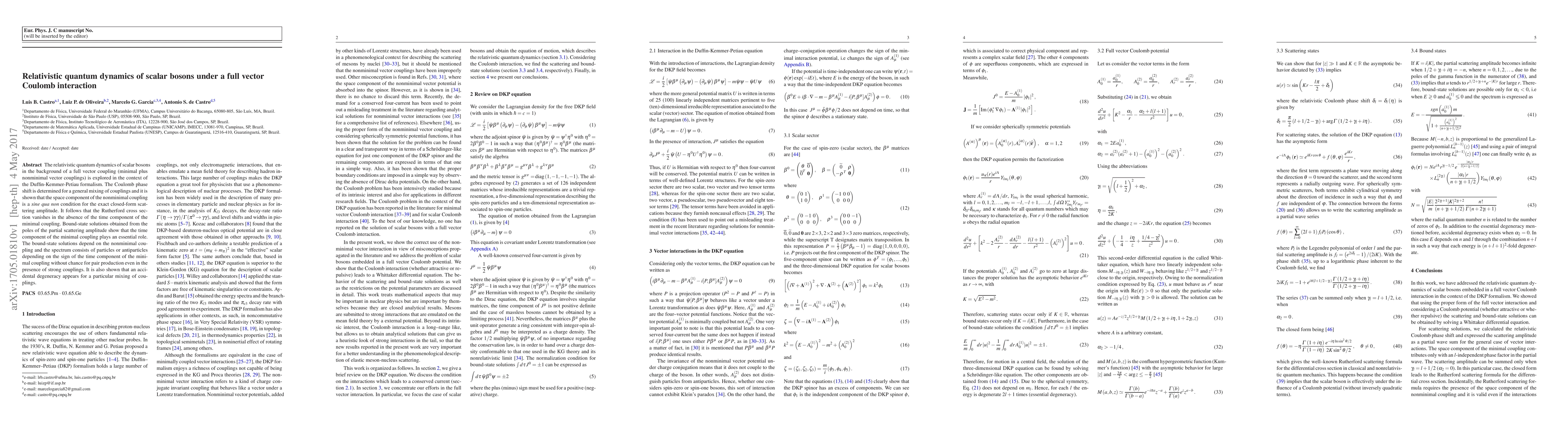 This paper investigates the relativistic quantum dynamics of scalar bosons under full vector Coulomb interactions using the Duffin-Kemmer-Petiau formalism, revealing that the nonminimal vector coupling is essential for exact scattering amplitudes, while the minimal coupling's time component is crucial for bound-state solutions and determines particle/antiparticle nature.