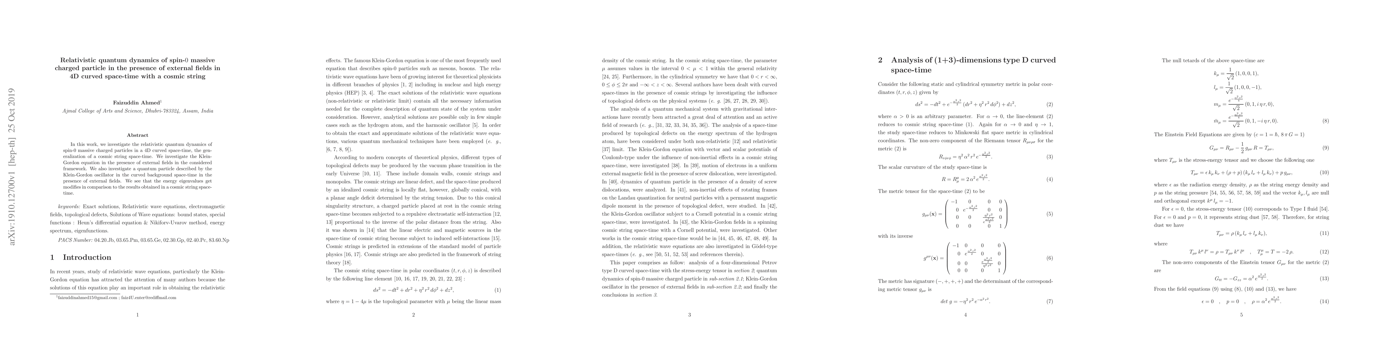 This paper explores the relativistic quantum dynamics of a spin-0 massive charged particle in a 4D curved space-time influenced by a cosmic string. It examines the Klein-Gordon equation in external fields and finds modified energy eigenvalues compared to those in a cosmic string space-time.