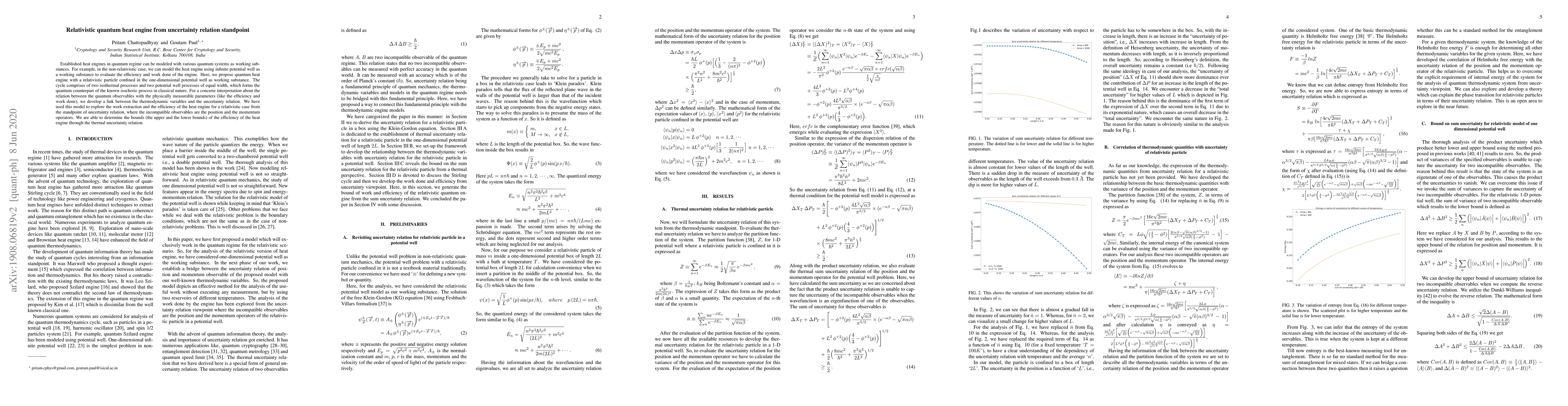 Established heat engines in quantum regime can be modeled with various quantum systems as working substances. For example, in the non-relativistic case, we can model the heat engine using infinite potential well as a working substance to evaluate the efficiency and work done of the engine. Here, we propose quantum heat engine with a relativistic particle confined in the one-dimensional potential well as working substance. The cycle comprises of two isothermal processes and two potential well processes of equal width, which forms the quantum counterpart of the known isochoric process in classical nature. For a concrete interpretation about the relation between the quantum observables with the physically measurable parameters (like the efficiency and work done), we develop a link between the thermodynamic variables and the uncertainty relation. We have used this model to explore the work extraction and the efficiency of the heat engine for a relativistic case from the standpoint of uncertainty relation, where the incompatible observables are the position and the momentum operators. We are able to determine the bounds (the upper and the lower bounds) of the efficiency of the heat engine through the thermal uncertainty relation.