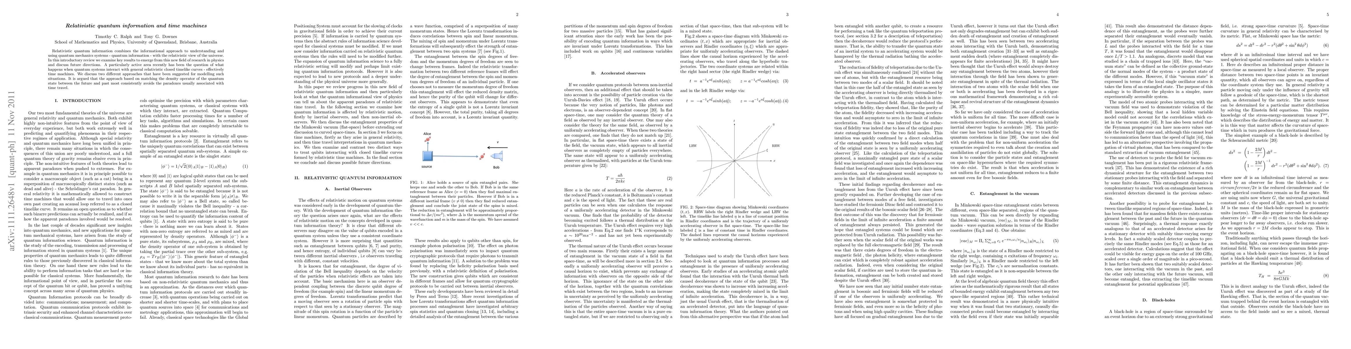 Relativistic quantum information combines the informational approach to understanding and using quantum mechanics systems - quantum information - with the relativistic view of the universe. In this introductory review we examine key results to emerge from this new field of research in physics and discuss future directions. A particularly active area recently has been the question of what happens when quantum systems interact with general relativistic closed timelike curves - effectively time machines. We discuss two different approaches that have been suggested for modelling such situations. It is argued that the approach based on matching the density operator of the quantum state between the future and past most consistently avoids the paradoxes usually associated with time travel.