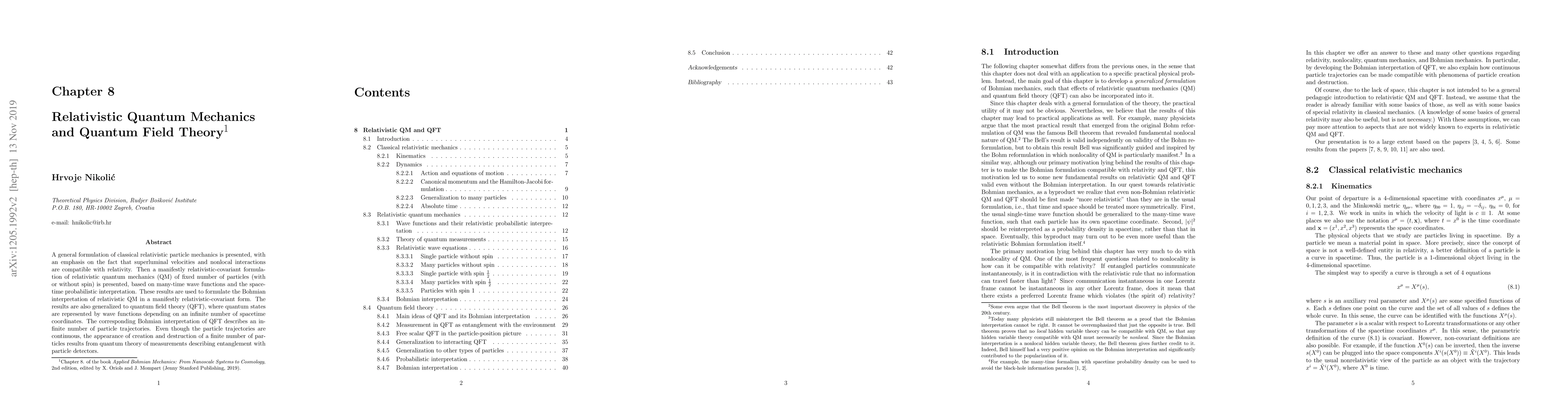 A general formulation of classical relativistic particle mechanics is presented, with an emphasis on the fact that superluminal velocities and nonlocal interactions are compatible with relativity. Then a manifestly relativistic-covariant formulation of relativistic quantum mechanics (QM) of fixed number of particles (with or without spin) is presented, based on many-time wave functions and the spacetime probabilistic interpretation. These results are used to formulate the Bohmian interpretation of relativistic QM in a manifestly relativistic-covariant form. The results are also generalized to quantum field theory (QFT), where quantum states are represented by wave functions depending on an infinite number of spacetime coordinates. The corresponding Bohmian interpretation of QFT describes an infinite number of particle trajectories. Even though the particle trajectories are continuous, the appearance of creation and destruction of a finite number of particles results from quantum theory of measurements describing entanglement with particle detectors.