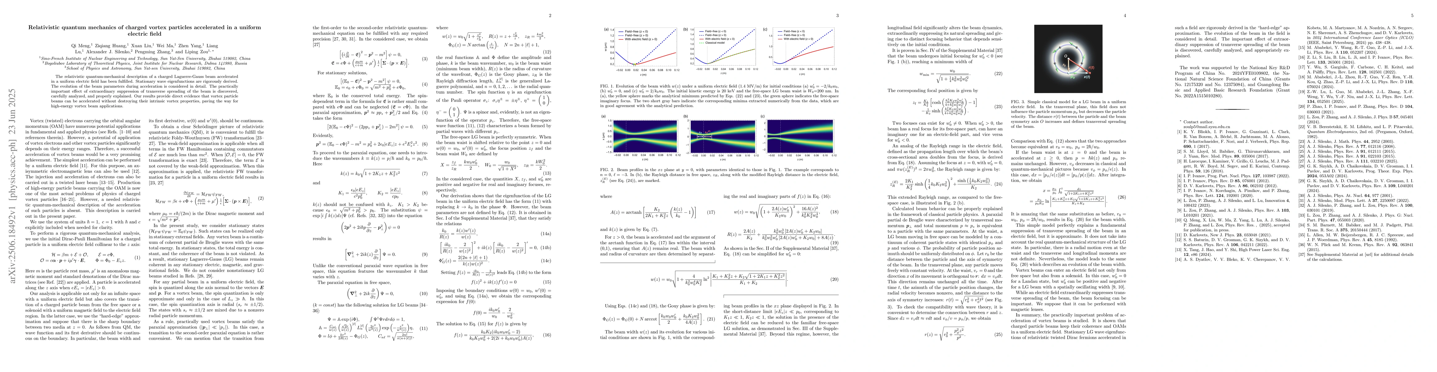 This research derives relativistic quantum-mechanical descriptions for charged Laguerre-Gauss beams in uniform electric fields, revealing that these beams can maintain their vortex properties during acceleration due to extraordinary suppression of transverse spreading. This finding suggests potential for high-energy vortex beam applications.