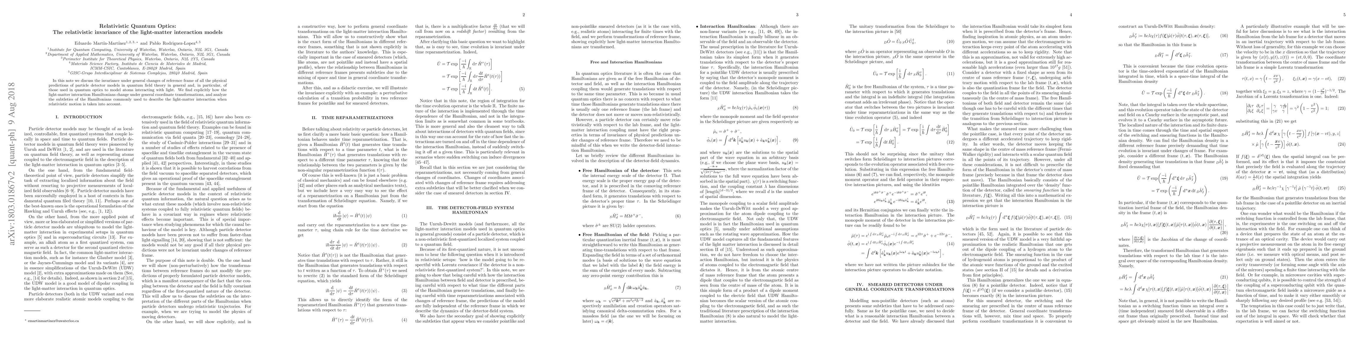 In this note we discuss the invariance under general changes of reference frame of all the physical predictions of particle detector models in quantum field theory in general and, in particular, of those used in quantum optics to model atoms interacting with light. We find explicitly how the light-matter interaction Hamiltonians change under general coordinate transformations, and analyze the subtleties of the Hamiltonians commonly used to describe the light-matter interaction when relativistic motion is taken into account.
