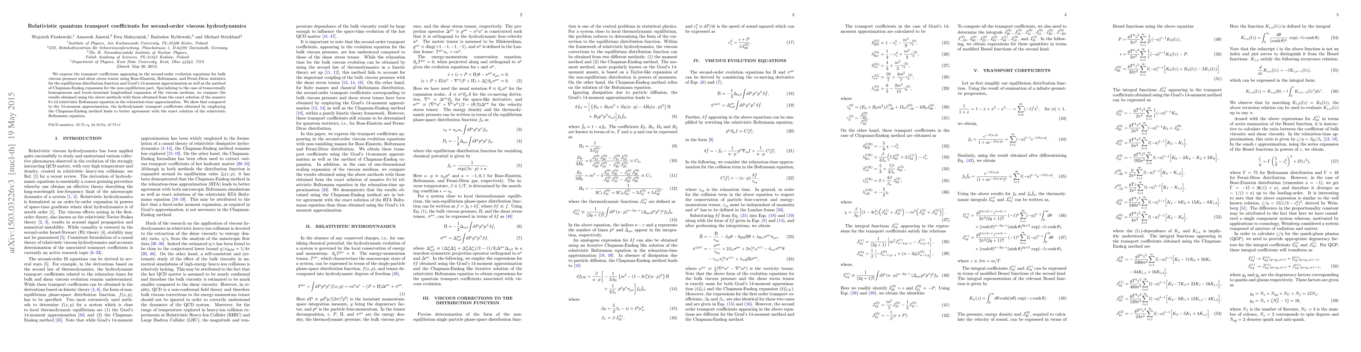 This paper derives relativistic quantum transport coefficients for second-order viscous hydrodynamics using Bose-Einstein, Boltzmann, and Fermi-Dirac statistics. It finds that the Chapman-Enskog method provides better agreement with the exact solution of the relativistic Boltzmann equation compared to Grad's 14-moment approximation.