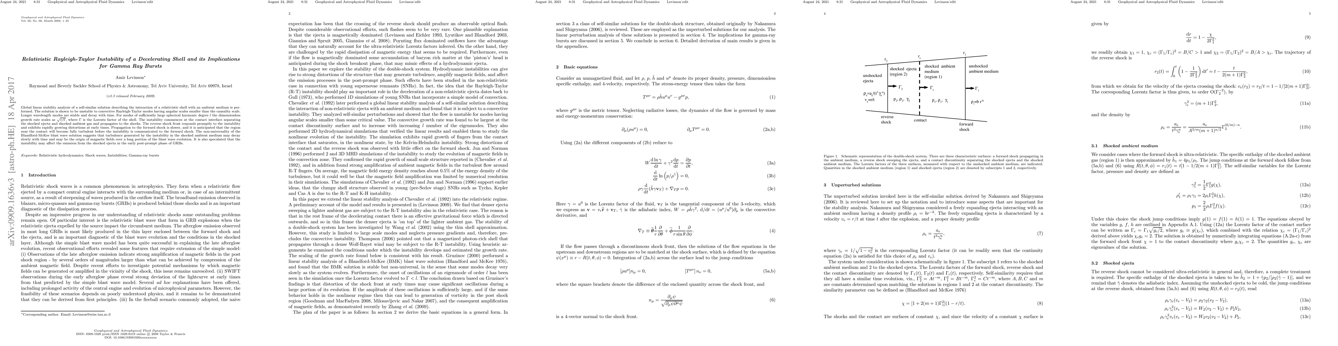 Global linear stability analysis of a self-similar solution describing the interaction of a relativistic shell with an ambient medium is performed. The solution is shown to be unstable to convective Rayleigh-Taylor modes having angular scales smaller than the causality scale. Longer wavelength modes are stable and decay with time. For modes of sufficiently large spherical harmonic degree $l$ the dimensionless growth rate scales as $\sqrt{l/\Gamma}$, where $\Gamma$ is the Lorentz factor of the shell. The instability commences at the contact interface separating the shocked eject a and shocked ambient gas and propagates to the shocks. The reverse shock front responds promptly to the in stability and exhibits rapidly growing distortions at early times. Propagation to the forward shock is slower, and it is anticipated that the region near the contact will become fully turbulent before the instability is communicated to the forward shock. The non-universality of the Blandford-McKee blast wave solution suggests that turbulence generated by the instability in the shocked ambient medium may decay slowly with time and may be the origin of magnetic fields over a long portion of the blast wave evolution. It is also speculated that the instability may affect the emission from the shocked ejecta in the early post-prompt phase of GRBs.