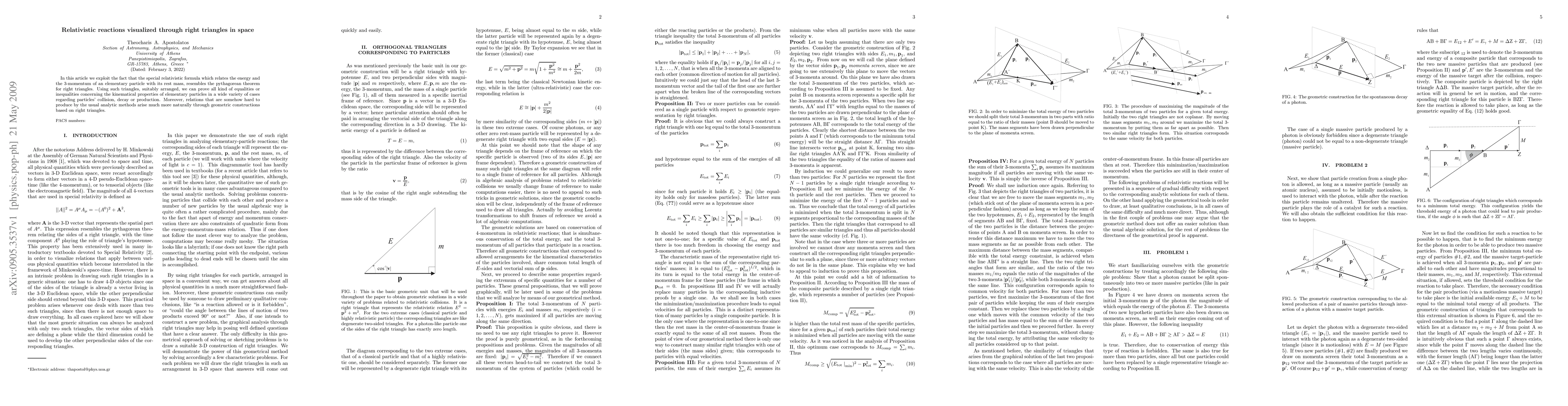Researchers used geometric right triangles to visualize relativistic reactions, proving equalities and inequalities for particle collisions, decay, and production. This approach provides a more natural method for deriving relations that are hard to obtain through traditional analytical methods.