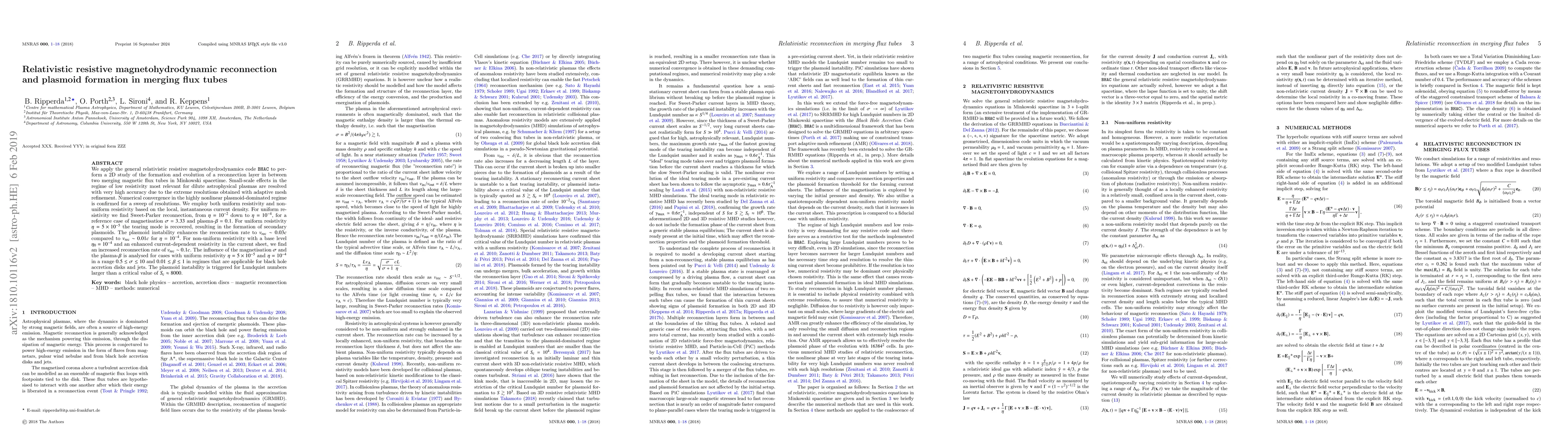 We apply the general relativistic resistive magnetohydrodynamics code {\tt BHAC} to perform a 2D study of the formation and evolution of a reconnection layer in between two merging magnetic flux tubes in Minkowski spacetime. Small-scale effects in the regime of low resistivity most relevant for dilute astrophysical plasmas are resolved with very high accuracy due to the extreme resolutions obtained with adaptive mesh refinement. Numerical convergence in the highly nonlinear plasmoid-dominated regime is confirmed for a sweep of resolutions. We employ both uniform resistivity and non-uniform resistivity based on the local, instantaneous current density. For uniform resistivity we find Sweet-Parker reconnection, from $\eta = 10^{-2}$ down to $\eta = 10^{-4}$, for a reference case of magnetisation $\sigma = 3.33$ and plasma-$\beta = 0.1$. {For uniform resistivity $\eta=5\times10^{-5}$ the tearing mode is recovered, resulting in the formation of secondary plasmoids. The plasmoid instability enhances the reconnection rate to $v_{\rm rec} \sim 0.03c$ compared to $v_{\rm rec} \sim 0.01c$ for $\eta=10^{-4}$.} For non-uniform resistivity with a base level $\eta_0 = 10^{-4}$ and an enhanced current-dependent resistivity in the current sheet, we find an increased reconnection rate of $v_{\rm rec} \sim 0.1c$. The influence of the magnetisation $\sigma$ and the plasma-$\beta$ is analysed for cases with uniform resistivity $\eta=5\times10^{-5}$ and $\eta=10^{-4}$ in a range $0.5 \leq \sigma \leq 10$ and $0.01 \leq \beta \leq 1$ in regimes that are applicable for black hole accretion disks and jets. The plasmoid instability is triggered for Lundquist numbers larger than a critical value of $S_{\rm c} \approx 8000$.