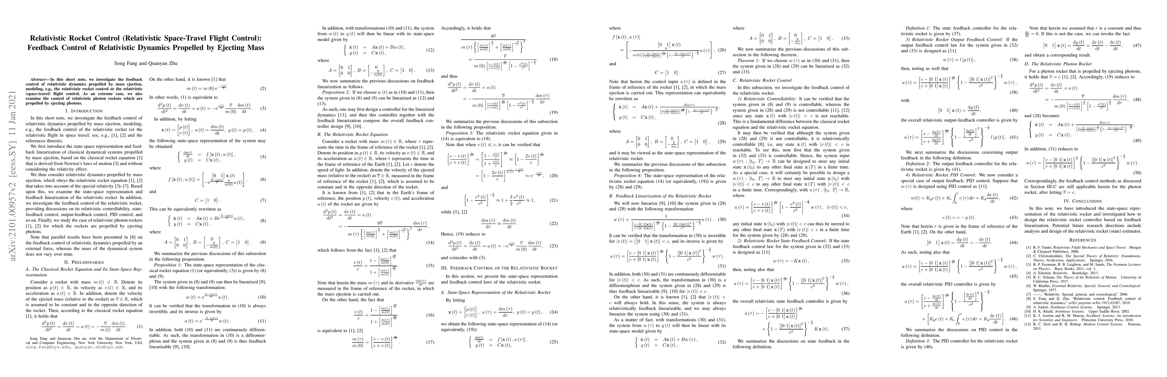 Researchers investigated feedback control of relativistic dynamics propelled by mass ejection in space travel, including photon rockets, to improve stability and accuracy. They developed a framework for controlling such systems using feedback mechanisms.