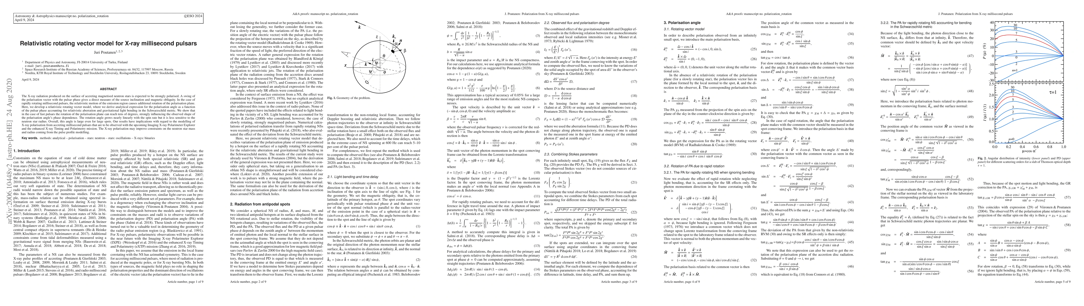 The X-ray radiation produced on the surface of accreting magnetised neutron stars is expected to be strongly polarised. A swing of the polarisation vector with the pulsar phase gives a direct measure of the source inclination and magnetic obliquity. In the case of rapidly rotating millisecond pulsars, the relativistic motion of the emission region causes additional rotation of the polarisation plane. Here, we develop a relativistic rotating vector model, where we derive analytical expression for the polarisation angle as a function of the pulsar phase accounting for relativistic aberration and gravitational light bending in the Schwarzschild metric. We show that in the case of fast pulsars the rotation of the polarisation plane can reach tens of degrees, strongly influencing the observed shape of the polarisation angle's phase dependence. The rotation angle grows nearly linearly with the spin rate but it is less sensitive to the neutron star radius. Overall, this angle is large even for large spots. Our results have implications with regard to the modelling of X-ray polarisation from accreting millisecond pulsars that are to be observed with the upcoming Imaging X-ray Polarimeter Explorer and the enhanced X-ray Timing and Polarimetry mission. The X-ray polarisation may improve constraints on the neutron star mass and radius coming from the pulse profile modelling.
