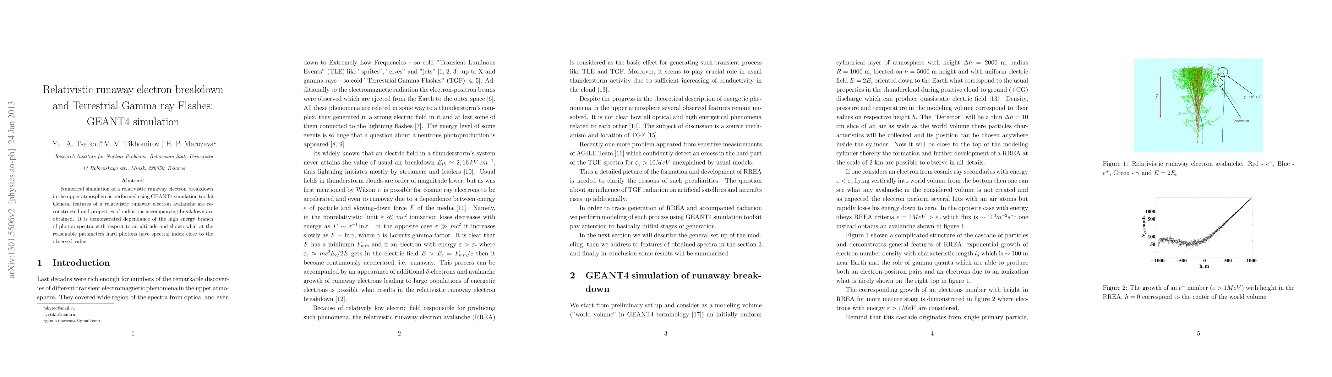 This paper uses GEANT4 simulation to model relativistic runaway electron breakdown in the upper atmosphere, reconstructing the general features of the avalanche and analyzing the accompanying radiation properties, showing that the high energy photon spectra depend on altitude and match observed spectral indices.
