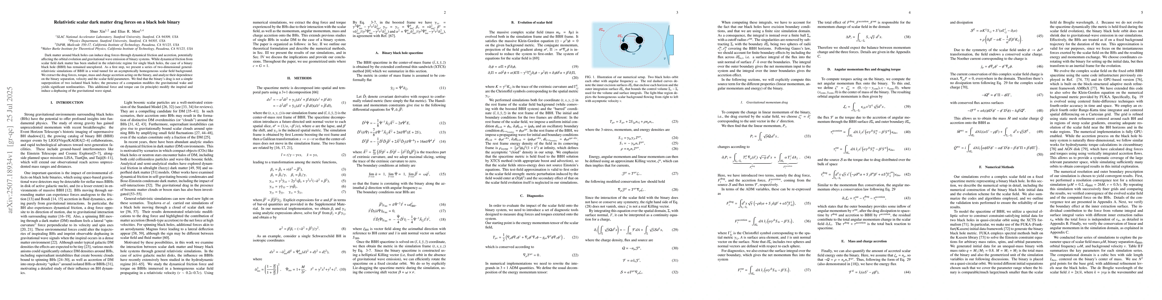 Dark matter around black holes can induce drag forces through dynamical friction and accretion, potentially affecting the orbital evolution and gravitational wave emission of binary systems. While dynamical friction from scalar field dark matter has been studied in the relativistic regime for single black holes, the case of a binary black hole (BBH) has remained unexplored. As a first step, we present a series of two-dimensional general-relativistic simulations of BBH in a wind tunnel for an asymptotically homogeneous scalar field background. We extract the drag forces, torque, mass and charge accretion acting on the binary, and analyze their dependence on the binary separation, velocity and the scalar field parameters. We find that the binary's drag is not a simple superposition of two isolated black holes; the presence of a companion modifies the gravitational wake and yields significant nonlinearities. This additional force and torque can (in principle) modify the inspiral and induce a dephasing of the gravitational wave signal.