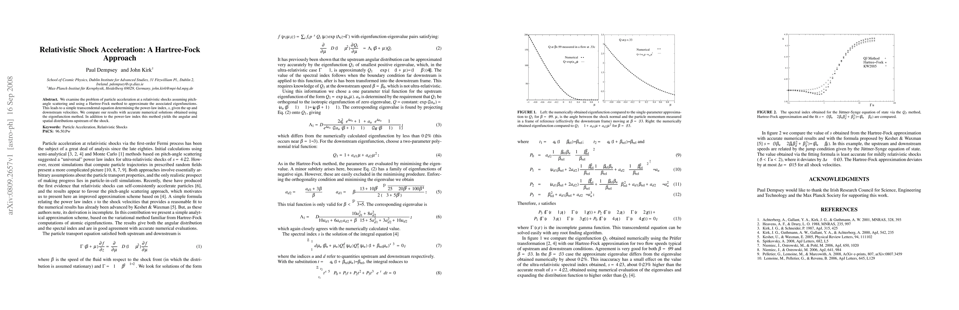 This paper explores relativistic shock acceleration using a Hartree-Fock approach to approximate eigenfunctions, deriving a transcendental equation for the power-law index $s$. It compares these results with numerical solutions, also providing insights into angular and spatial distributions upstream of the shock.