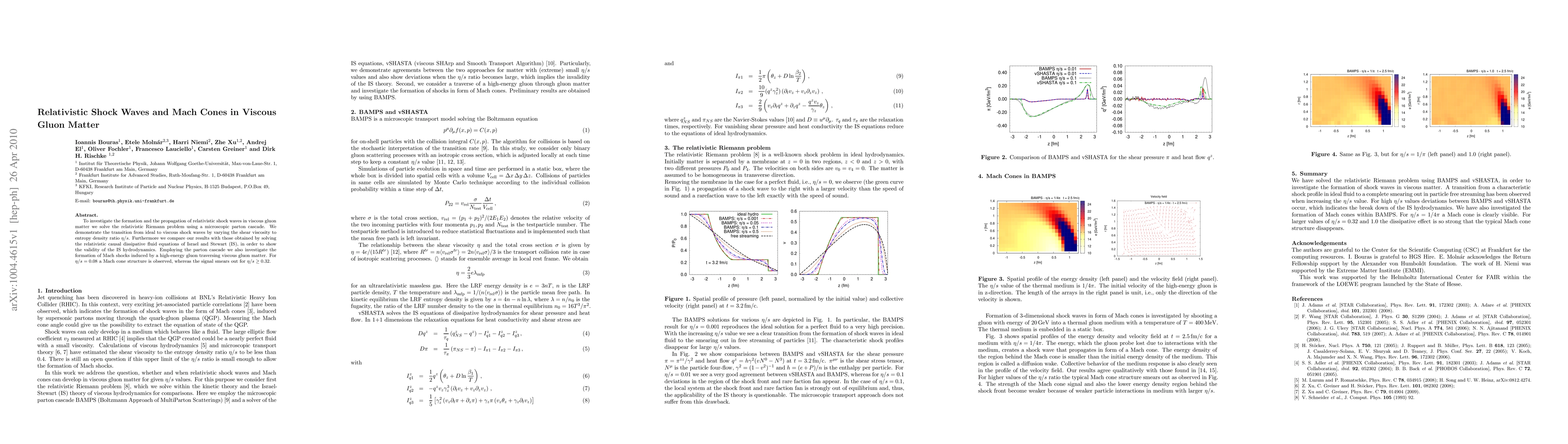 This paper investigates the formation and propagation of relativistic shock waves in viscous gluon matter, demonstrating the transition from ideal to viscous shock waves by varying the shear viscosity to entropy density ratio $\eta/s$. The study also examines the formation of Mach cones using a parton cascade model, finding a Mach cone at $\eta/s = 0.08$ that smears out for higher ratios.