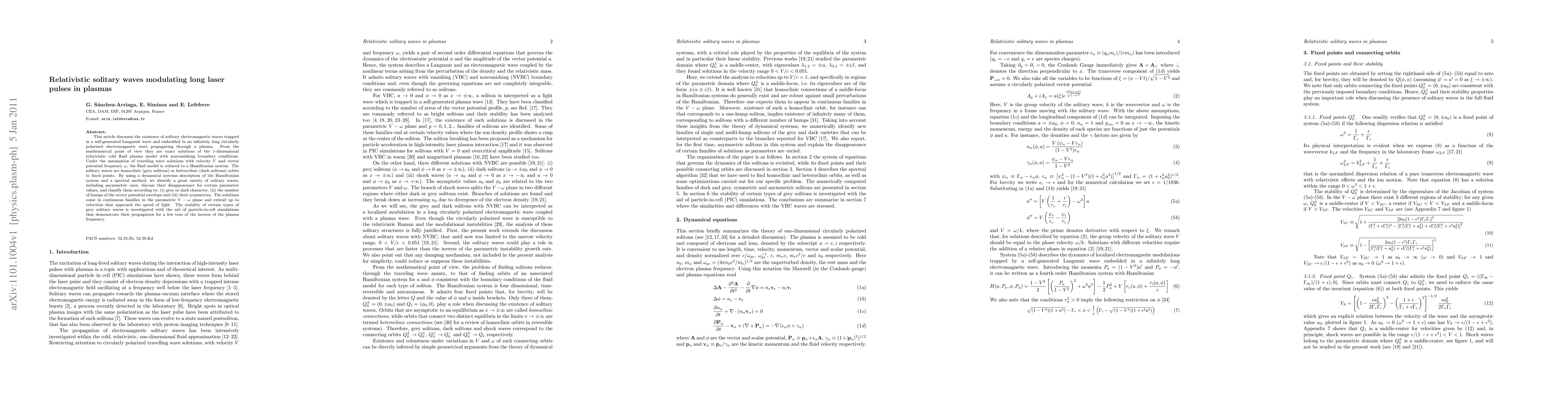 This paper explores solitary electromagnetic waves in plasmas, revealing exact solutions of a relativistic cold fluid model. It identifies various types of solitary waves, including grey and dark solitons, and investigates their stability through simulations.