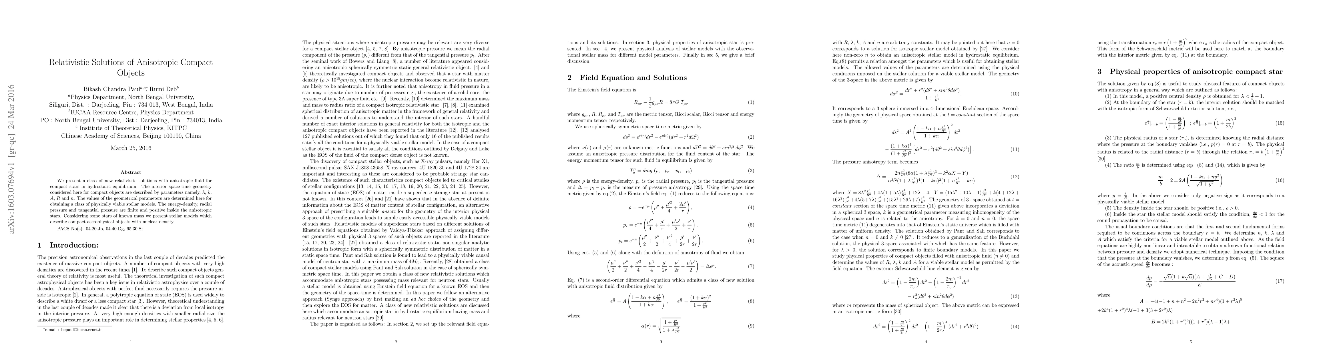 We present a class of new relativistic solutions with anisotropic fluid for compact stars in hydrostatic equilibrium. The interior space-time geometry considered here for compact objects are described by parameters namely, $\lambda$, $k$, $A$, $R$ and $n$. The values of the geometrical parameters are determined here for obtaining a class of physically viable stellar models. The energy-density, radial pressure and tangential pressure are finite and positive inside the anisotropic stars. Considering some stars of known mass we present stellar models which describe compact astrophysical objects with nuclear density.