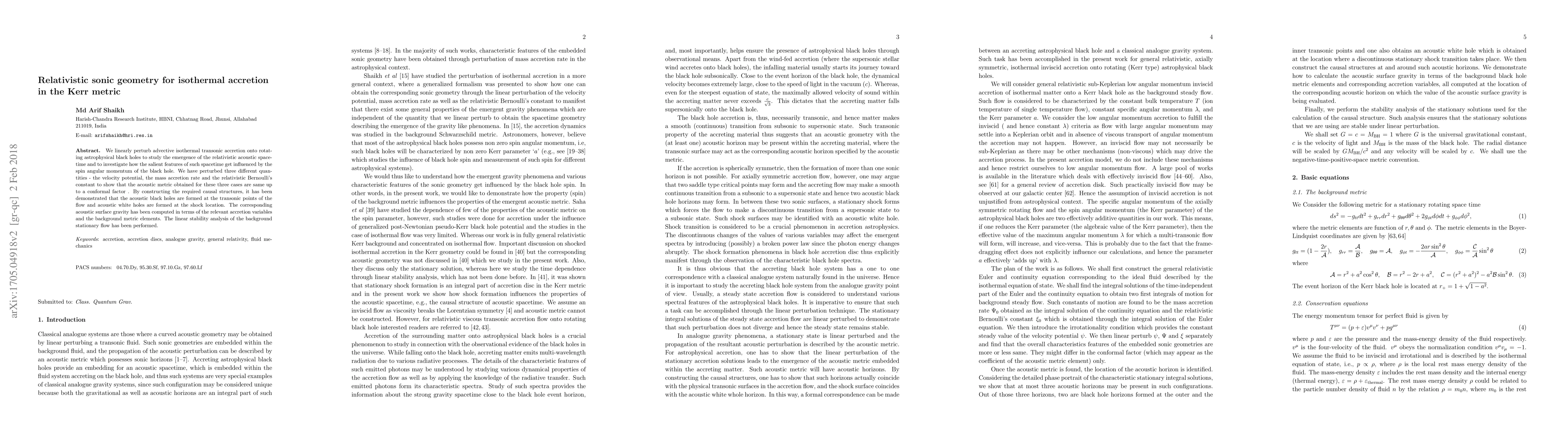 We linearly perturb advective isothermal transonic accretion onto rotating astrophysical black holes to study the emergence of the relativistic acoustic spacetime and to investigate how the salient features of such spacetime get influenced by the spin angular momentum of the black hole. We have perturbed three different quantities - the velocity potential, the mass accretion rate and the relativistic Bernoulli's constant to show that the acoustic metric obtained for these three cases are same up to a conformal factor. By constructing the required causal structures, it has been demonstrated that the acoustic black holes are formed at the transonic points of the flow and acoustic white holes are formed at the shock location. The corresponding acoustic surface gravity has been computed in terms of the relevant accretion variables and the background metric elements. The linear stability analysis of the background stationary flow has been performed.